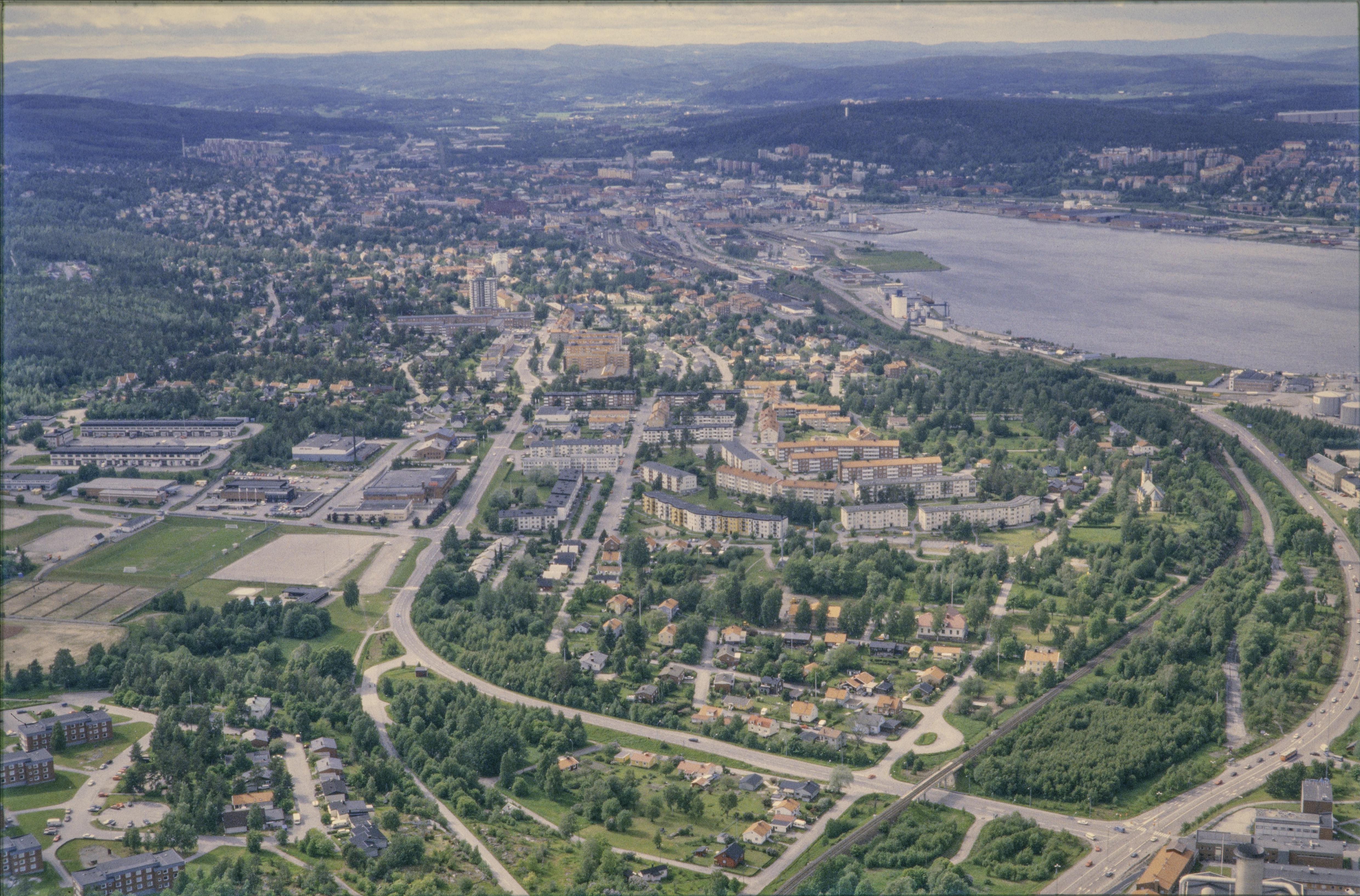 Beskrivning: Sundsvalls stad vid Sundsvallsfjärden. I bildens nedre del stadsdelen Skönsmon. Vid vägen i bildens högra kant vägmärke RAÄnr Sundsvall 25:1. Bilden är tagen mot (väderstreck): V