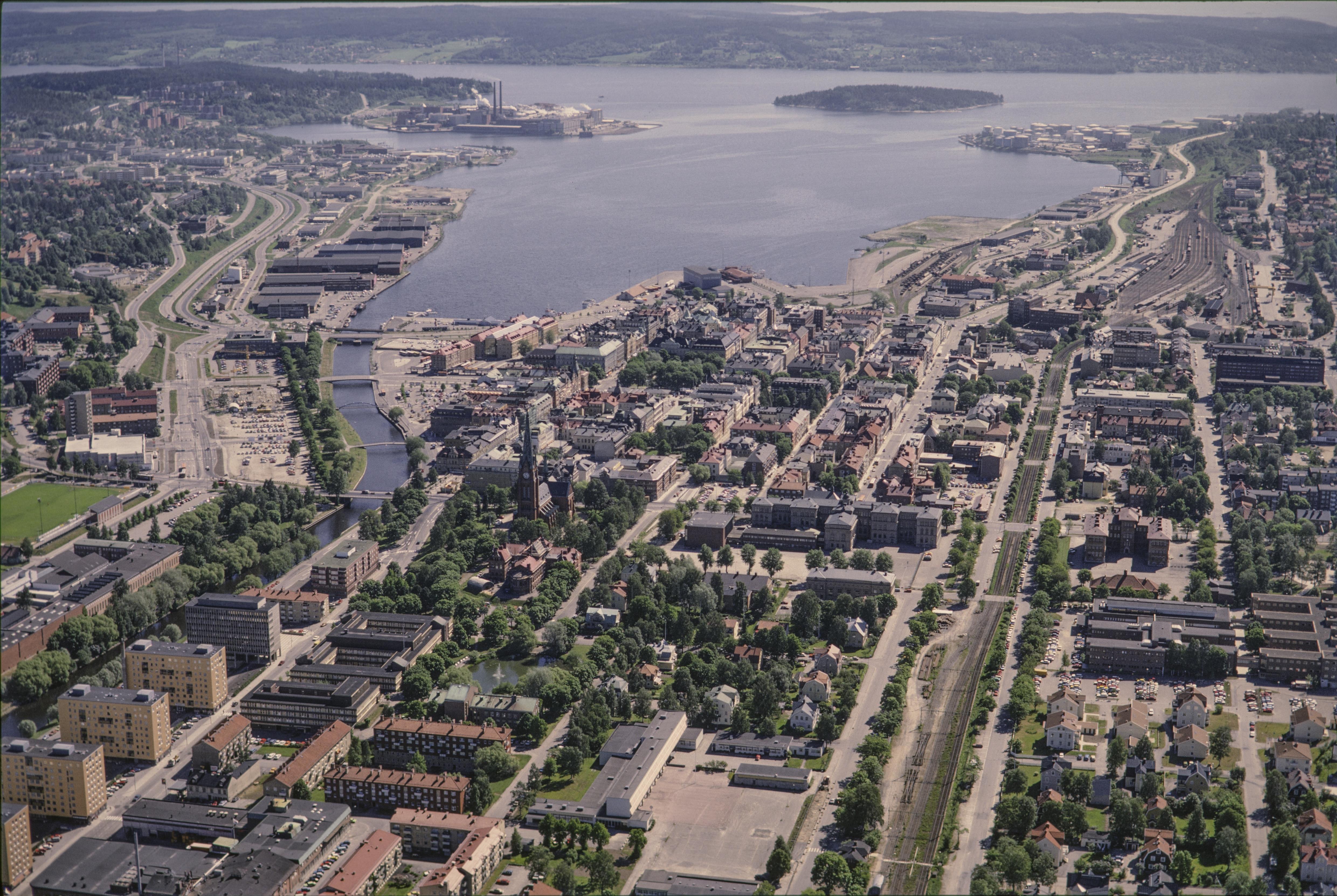 Beskrivning: Sundsvall stad. I bildens nedre del området Stenstaden och Selångeråns utlopp i Sundsvallsfjärden. Till vänster under bildens mitt Gustav Adolfs kyrka i stadslager RAÄnr Sundsvall 21:1. Bilden är tagen mot (väderstreck): Ö