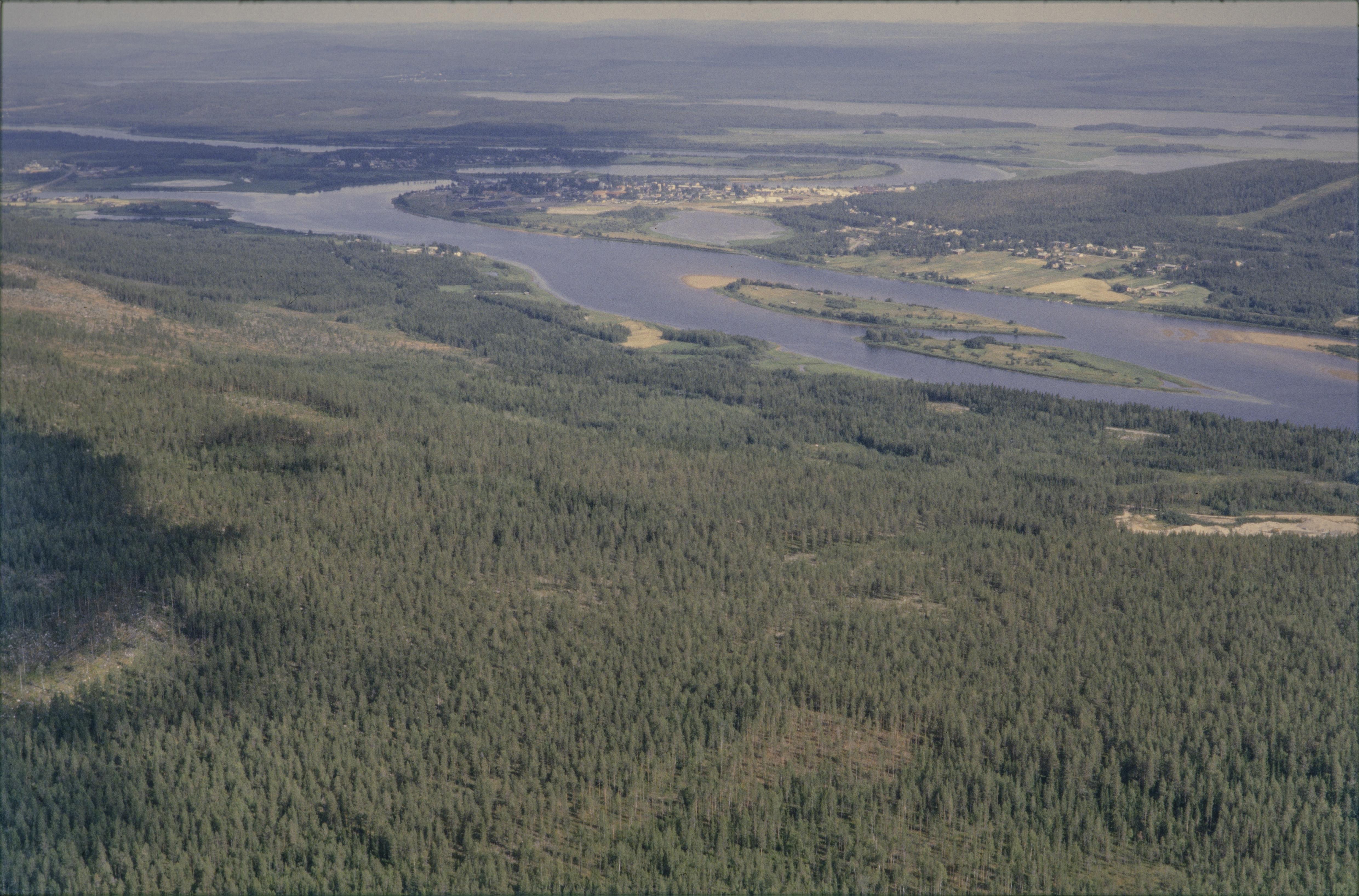 Beskrivning: Anmärkning (övrig): Riksintresse-nr/namn: BD70 - Överkalix. Socken: Överkalix. Motivering: Centralbygd med förhistorisk bruknings- och bosätttningskontinuitet kring sammanflödet av Kalixälven och Ängesån samt ett välbevarat odlingslandskap med många bevarade drag. (Fornlämningsmiljö, Bymiljö). - Uttryck för riksintresset: Fornlämningar, bla boplatsvallar, boplatsgropar, gravar, kokgropar, boplatslämningar av stenålderskaraktär, härdar och sommargravar. Byar med äldre välbevarad bebyggelse, gamla gårdslägen och bevarad byastrukturer. Odlingslandskap längs älven som hävdas och har äldre drag kvar såsom diken, åkerholmar och lador. [Texten uppdaterat av Riksantikvarieämbetet våren 2013.] Beskrivning: I bildens nedre del Halljärvheden. Över bildens mitt byn Kangis vid Kalixälven. I byn fyndplats RAÄnr Överkalix 1030:1. Uppe till vänster sammanflödet mellan Ängesån (till vänster) och Kalixälven. Över bildens mitt Överkalix ort och kyrkby. Bilden är tagen mot (väderstreck): NNO Fotosyfte: Flygbildsdokumentation