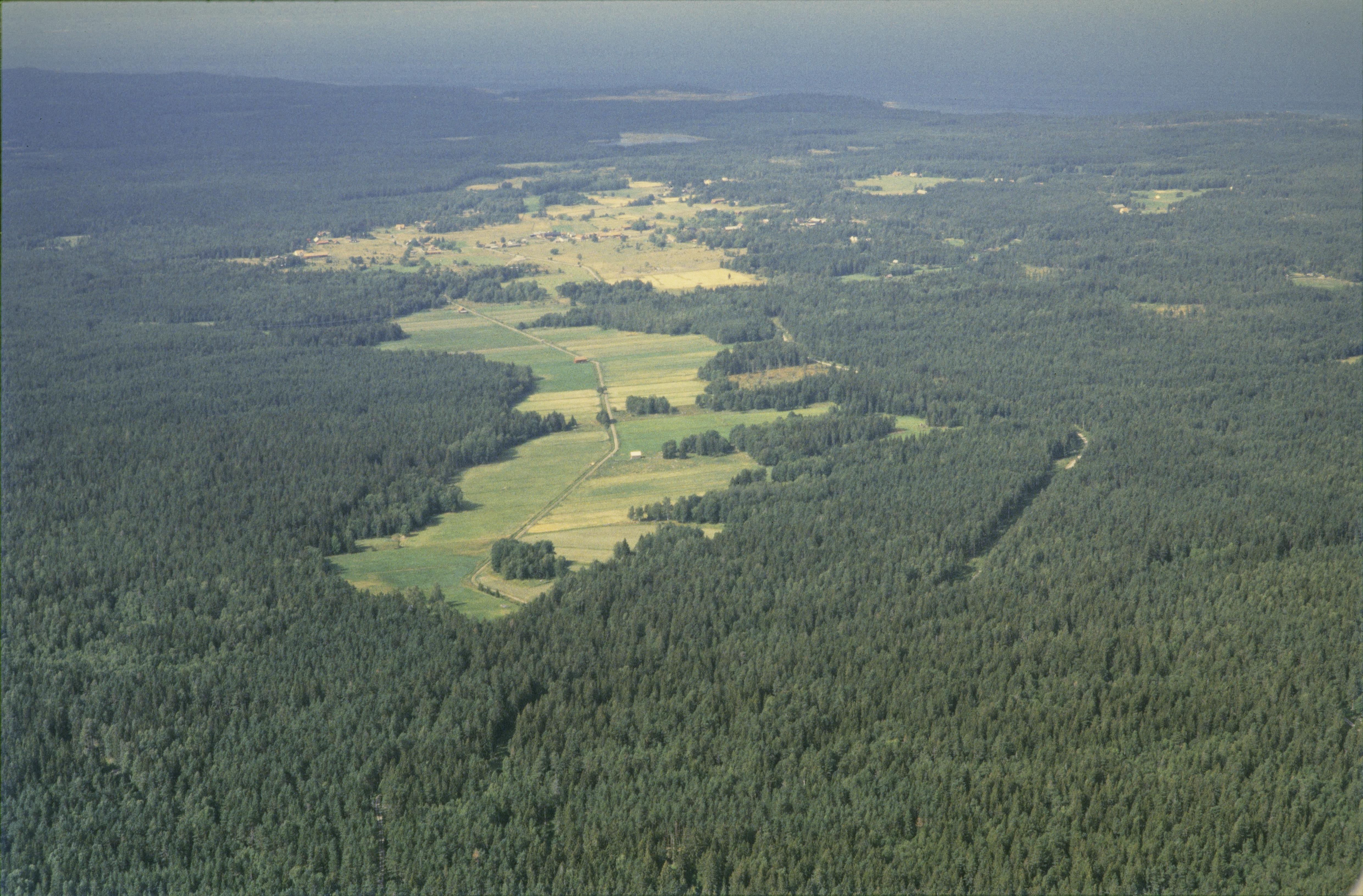 Beskrivning: Österrönningens dalgång. Över bildens mitt Hållens by i bytomt RAÄnr Hållnäs 280. Till höger i bildens övre del Björns skärgårds naturreservat. Bilden är tagen mot (väderstreck): NV