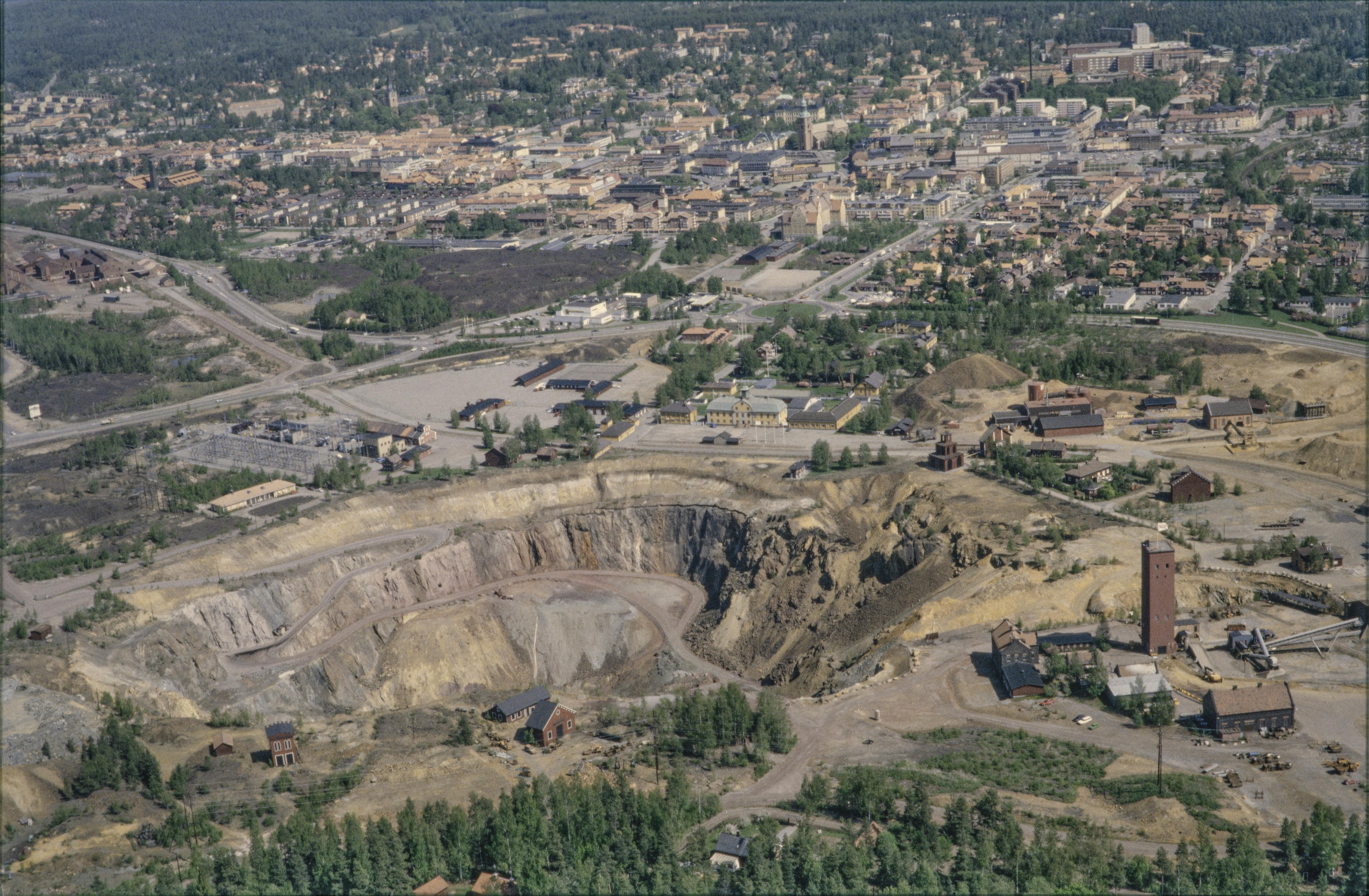 Beskrivning: I bildens nedre del gruvhålet Stora Stöten RAÄnr Falun 17:1 i Falu koppargruva sydväst i Falu stad. Gruvmuseet vid bildens mitt. Falu Kristine kyrka i bildens övre del. Bilden är tagen mot (väderstreck): NO