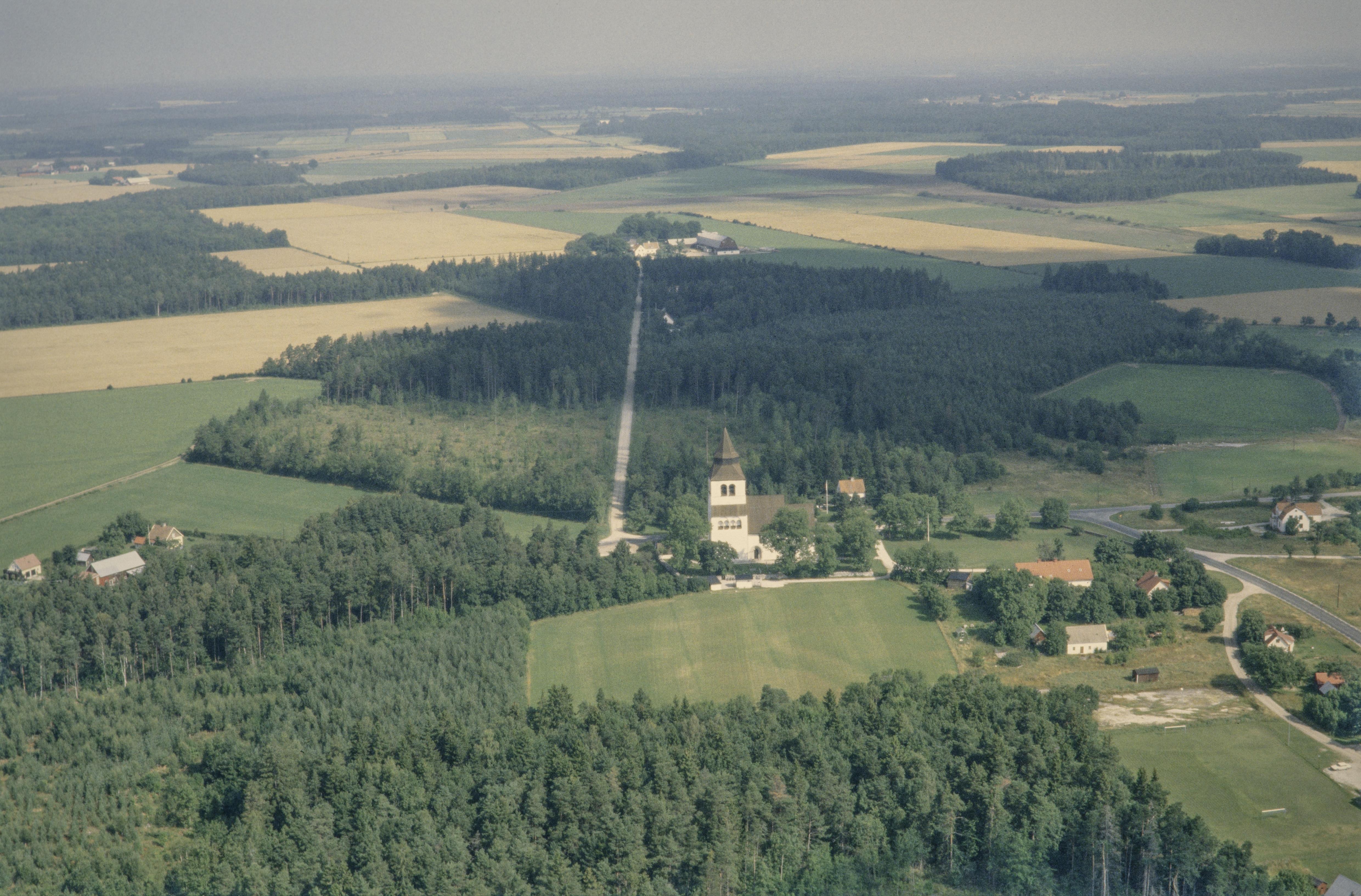 Beskrivning: Lokrume kyrkby. Lokrume kyrka vid bildens mitt. Stenby gård över bildens mitt. I bildens nedre del stensättningar RAÄnr Lokrume 2:1-2 m.fl. Bilden är tagen mot (väderstreck): NNO