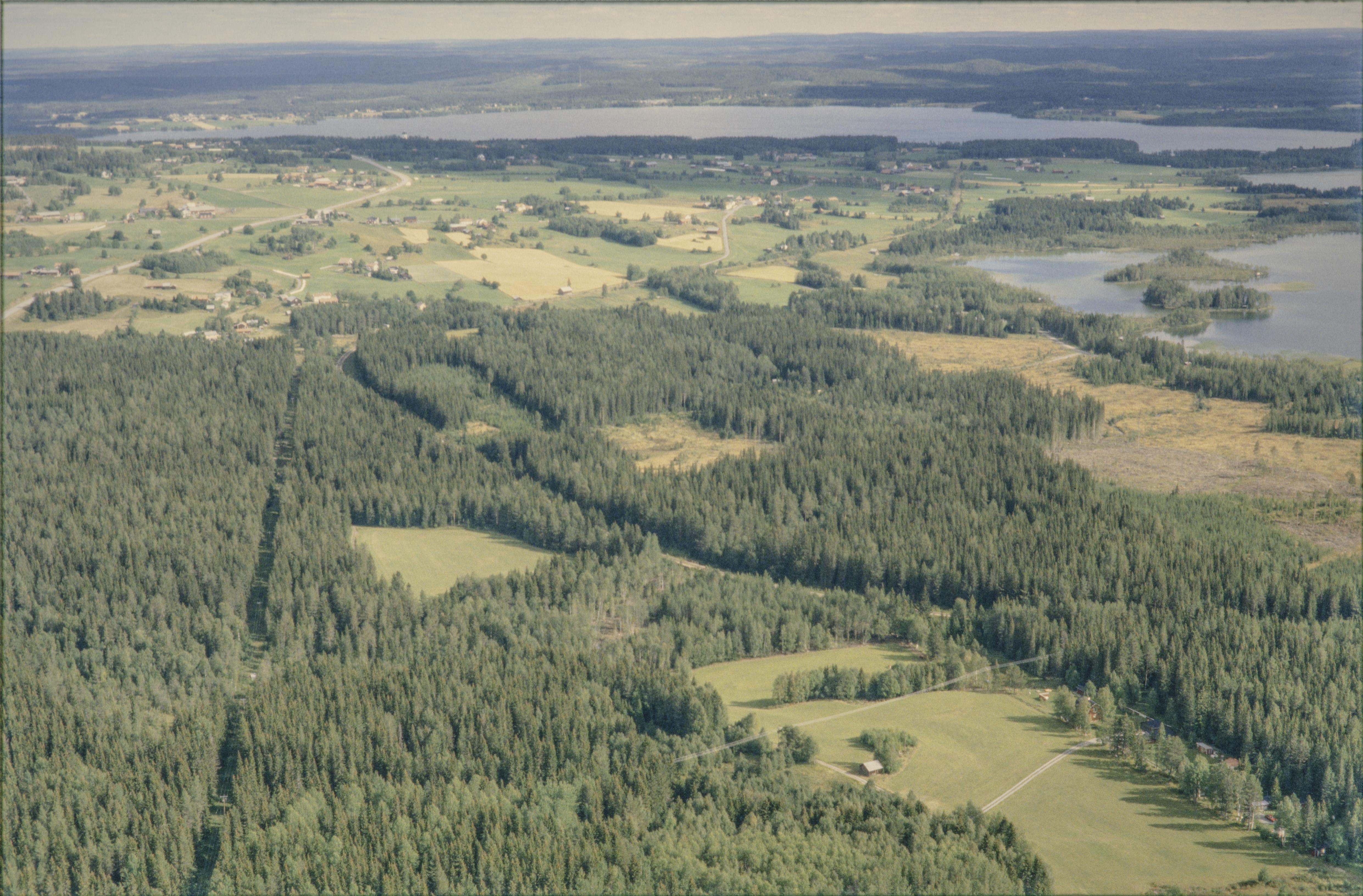 Beskrivning: Lockne kyrkby på västra sidan av Locknesjön. Lockne kyrka över bildens mitt. Nere till vänster gravfält RAÄnr Lockne 51:1 och hög 128:1 söder om området Höggärde. Bilden är tagen mot (väderstreck): NO