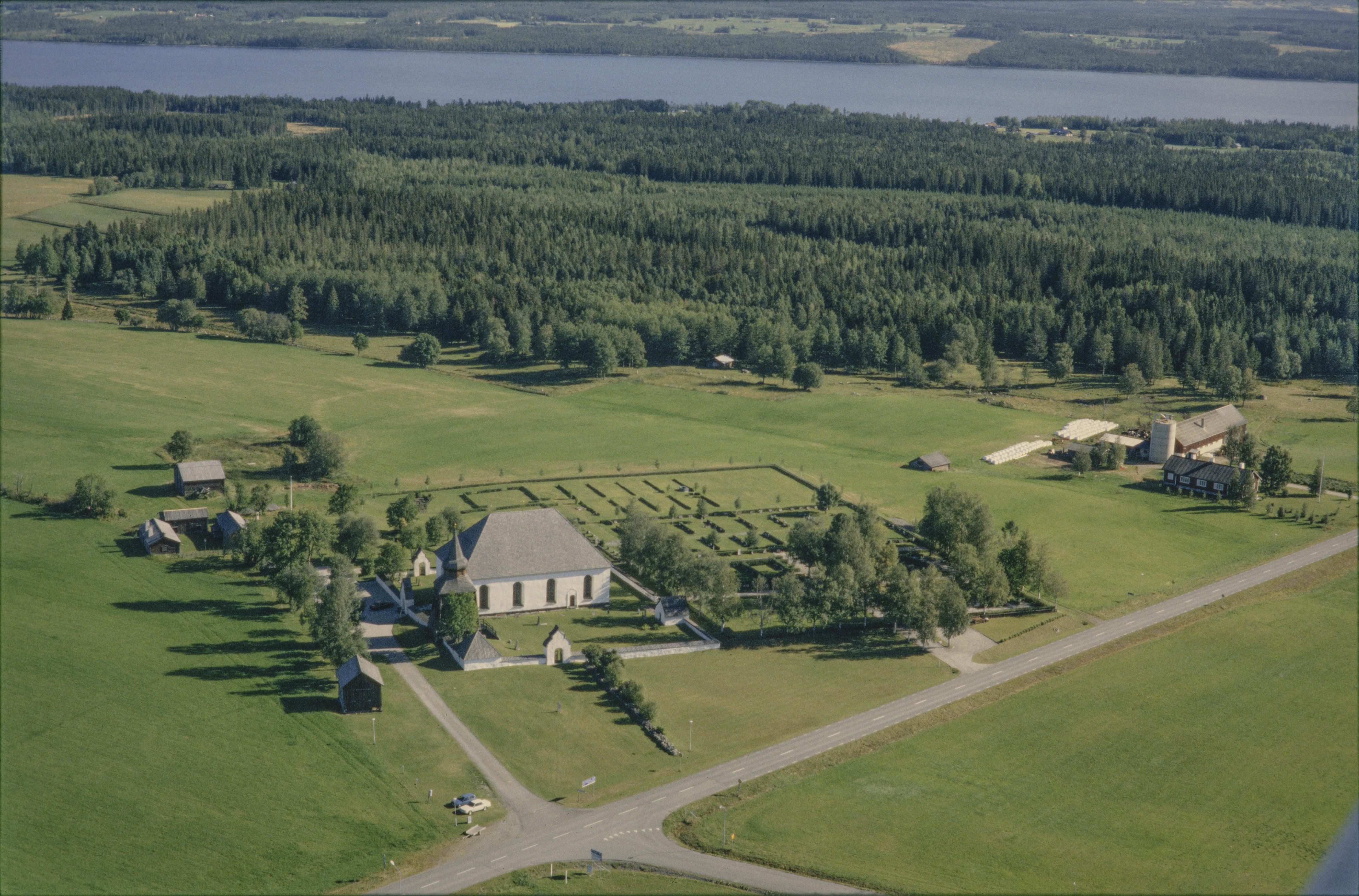 Beskrivning: Ovikens kyrkby. Ovikens gamla kyrka under bildens mitt. Vid kyrkan minnesmärke och bytomt RAÄnr Oviken 57:1-2 m.fl. I bildens övre kant Sannsundet i Storsjön mot socknet Hackås. Bilden är tagen mot (väderstreck): NNO
