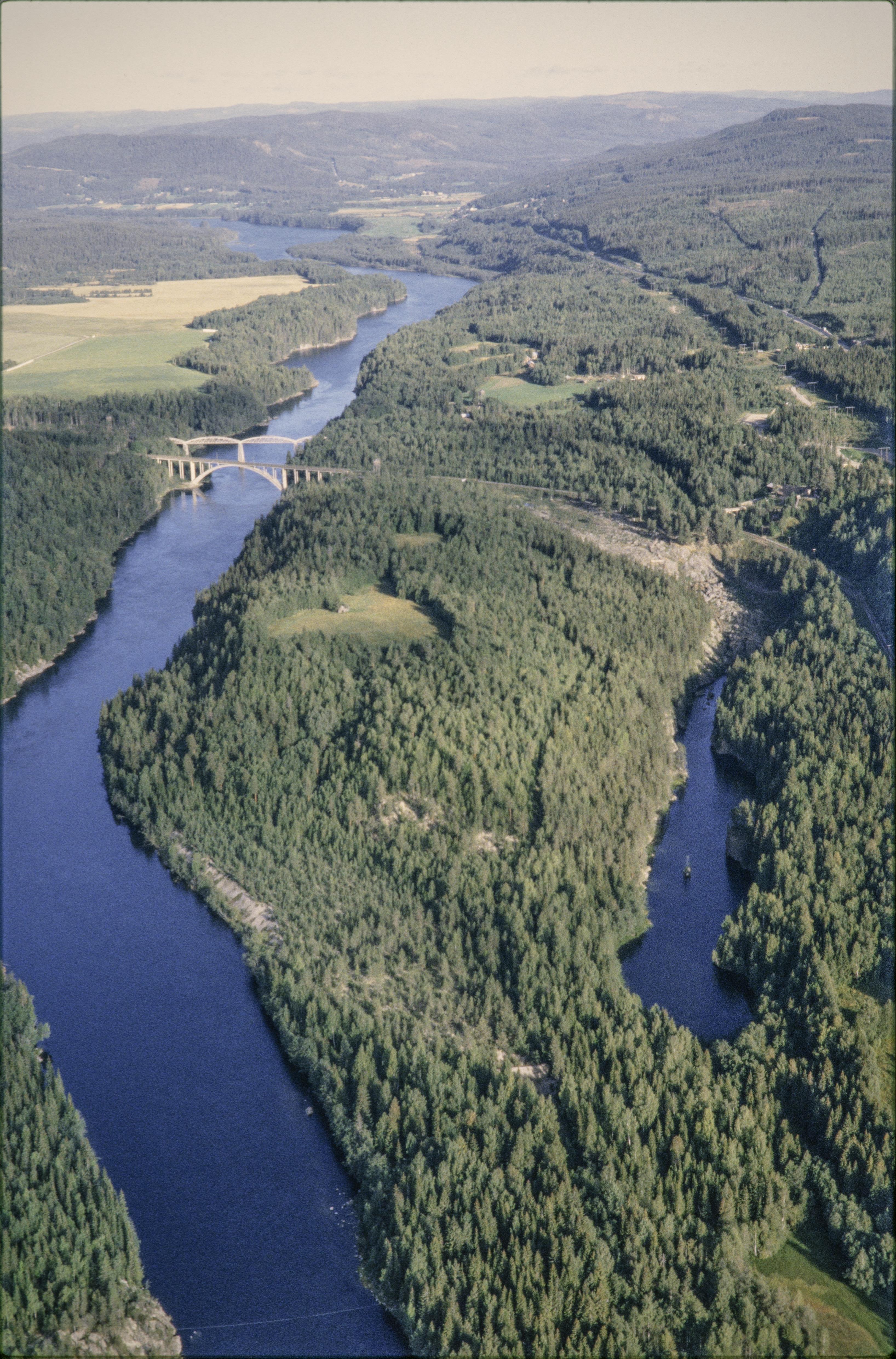 Beskrivning: Indalsälven i bildens vänstra del. Till höger naturreservatet Döda fallet (ett vattenfall som blev torrlagd vid tömning av Ragundasjön år 1796). Vid Döda fallet ett minnesmärke RAÄnr Ragunda 385:1, ett gruvhål Ragunda 387:1 m.m. Gränsen mot Fors socken i bildens högra kant. Bilden är tagen mot (väderstreck): VNV