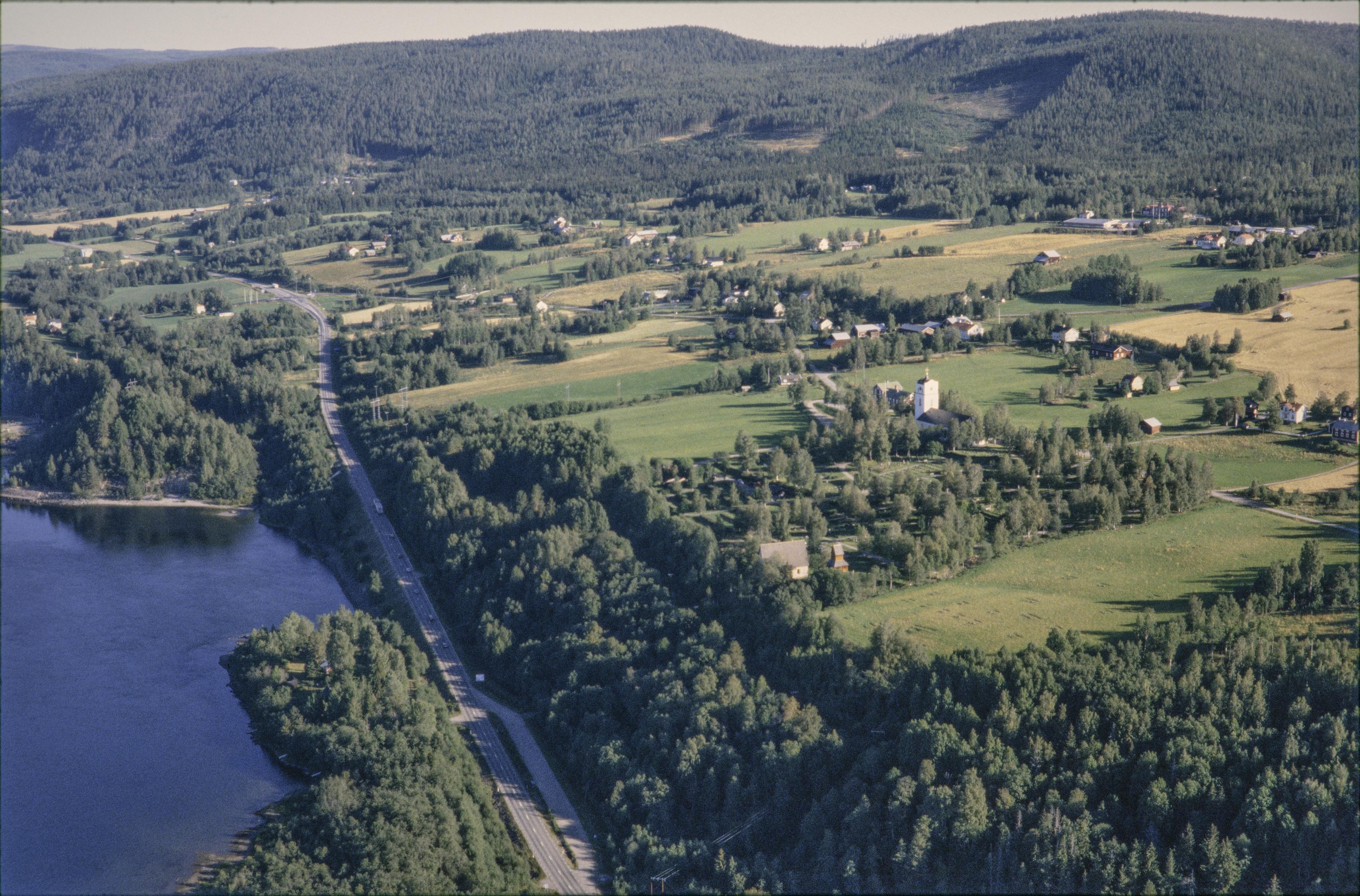 Beskrivning: Ragunda kyrkby vid Indalsälven. Ragunda gamla kyrka vid boplats RAÄnr Ragunda 65:1 under bildens mitt. Ragunda (nya) kyrka till höger om bildens mitt. Bilden är tagen mot (väderstreck): NNO