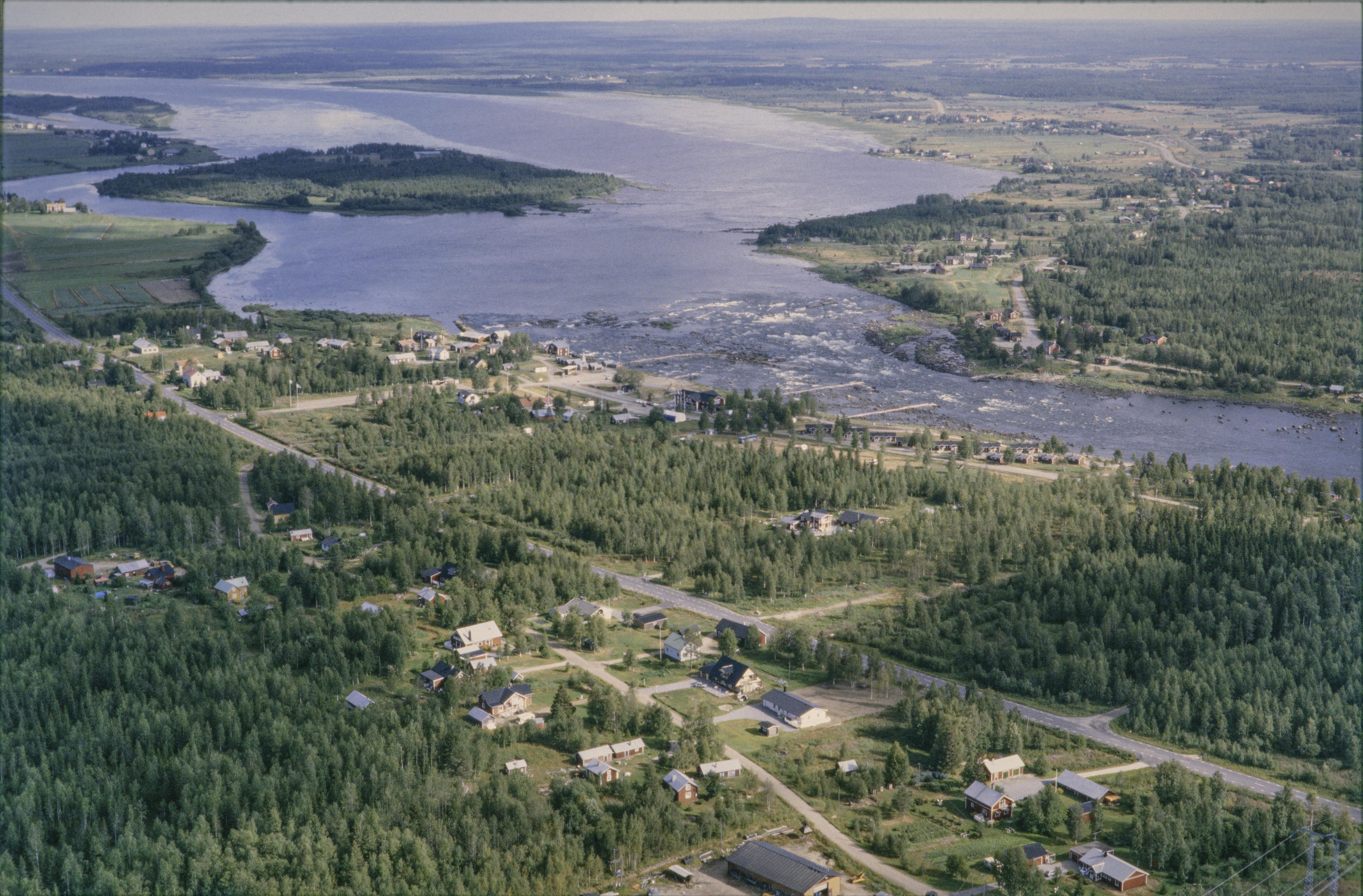 Beskrivning: Kukkola (Koskenpää) by i Tornedalen. Riksgränsen mot Finland över bildens mitt. Vid bildens mitt Kukkolaforsen i Torneälven. Till vänster om bildens mitt kalkugn RAÄnr Karl Gustav 182:1. Bilden är tagen mot (väderstreck): N