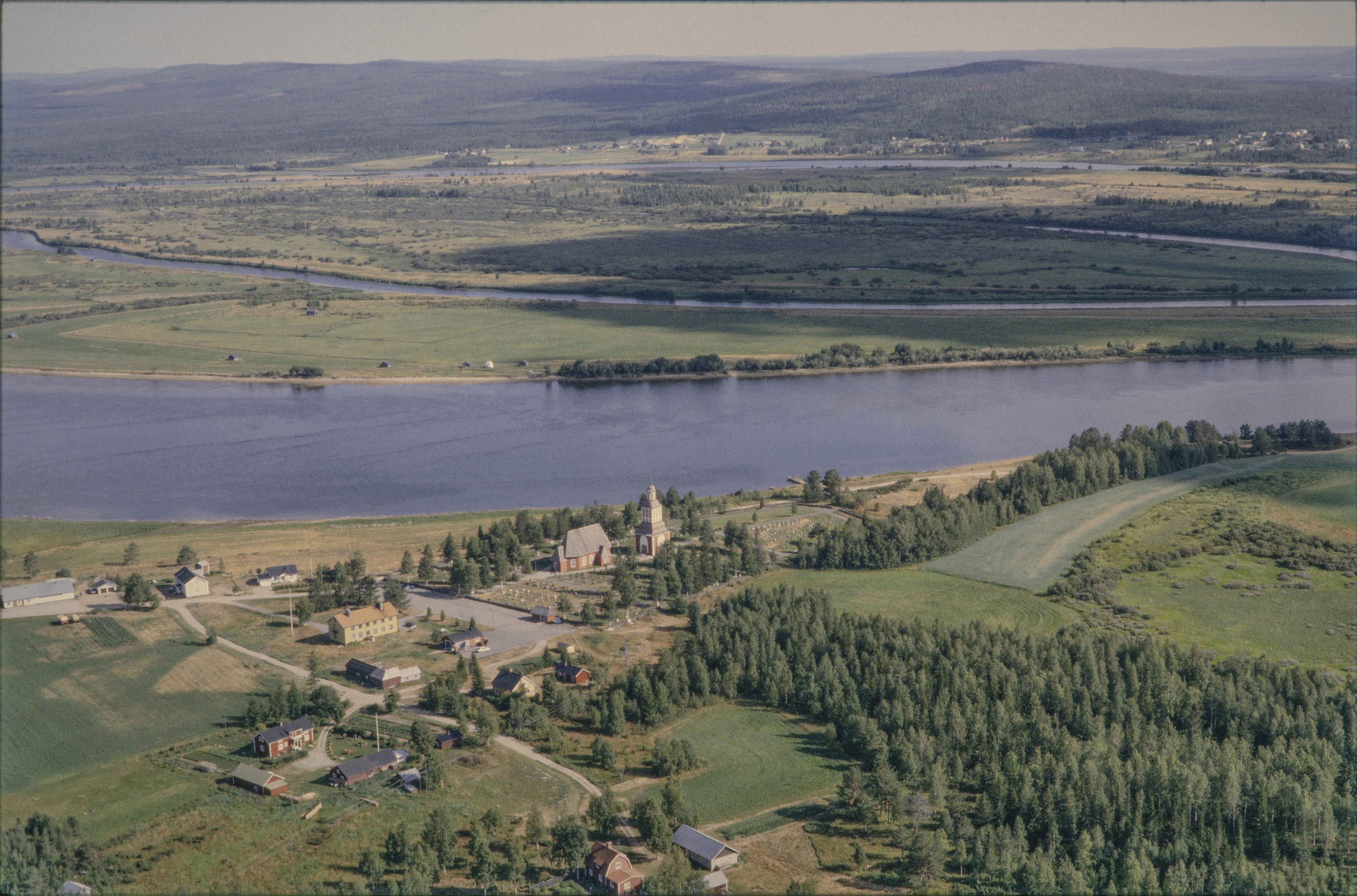Beskrivning: Hietaniemi kyrkby i orten Hedenäset vid Torneälven i Tornedalen. Hietaniemi kyrka under bildens mitt. Vid kyrkan bytomt RAÄnr Hietaniemi 326:1, gränsmärke Hietaniemi 61:1, m.m. Torneälven markerar riksgränsen mot Finland (i bildens övre del). Bilden är tagen mot (väderstreck): ONO
