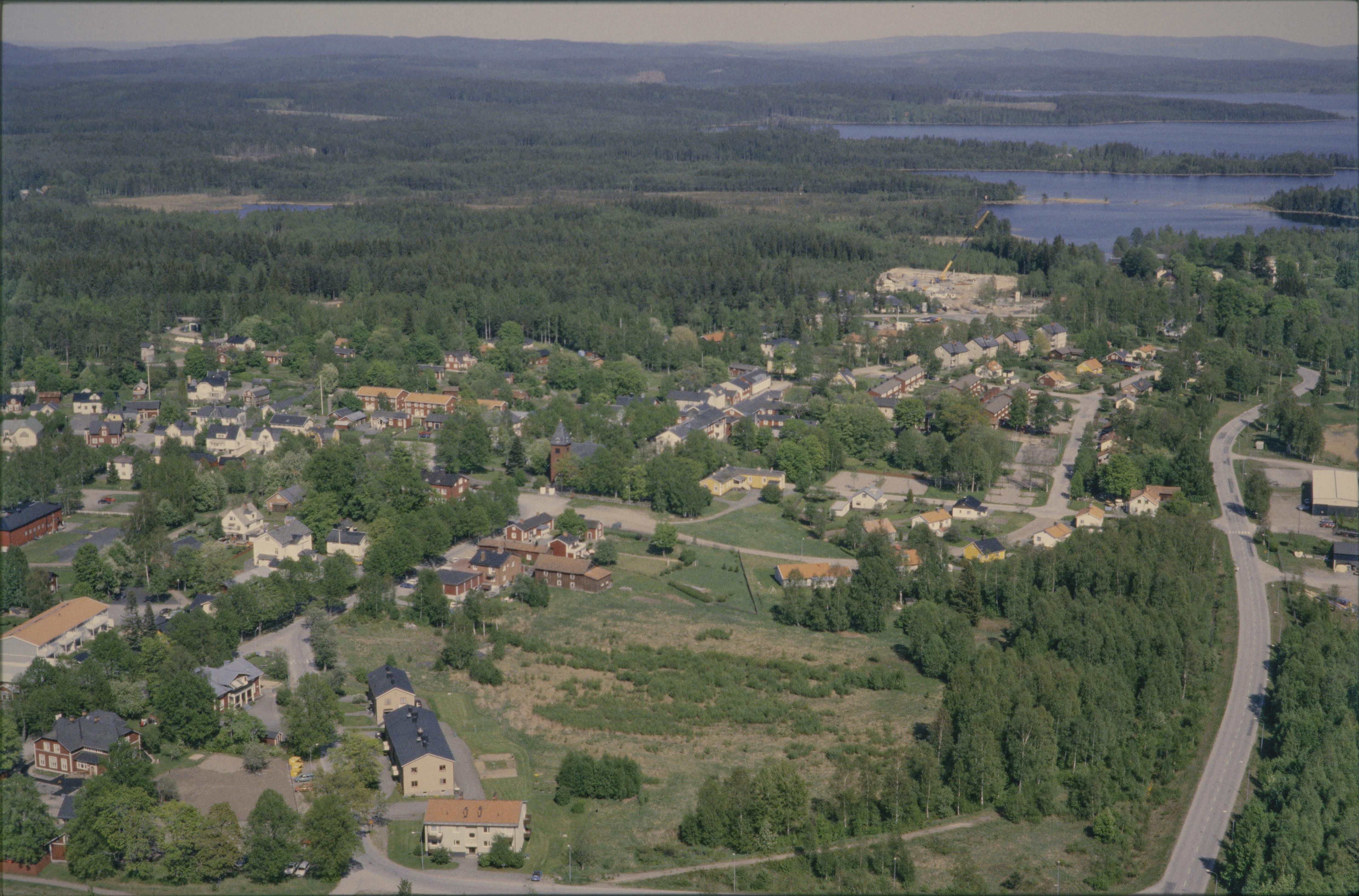 Beskrivning: Tätorten Grythyttan. Till vänster under bildens mitt Grythyttans kyrka RAÄnr Grythyttan 88:1. Sjön Sör-Älgen i bildens övre del. Till höger över bildens mitt Grythyttans gamla tomt och brukslämning RAÄnr Grythyttan 45:1-2 vid bron Grythyttan 110:1. Bilden är tagen mot (väderstreck): OSO