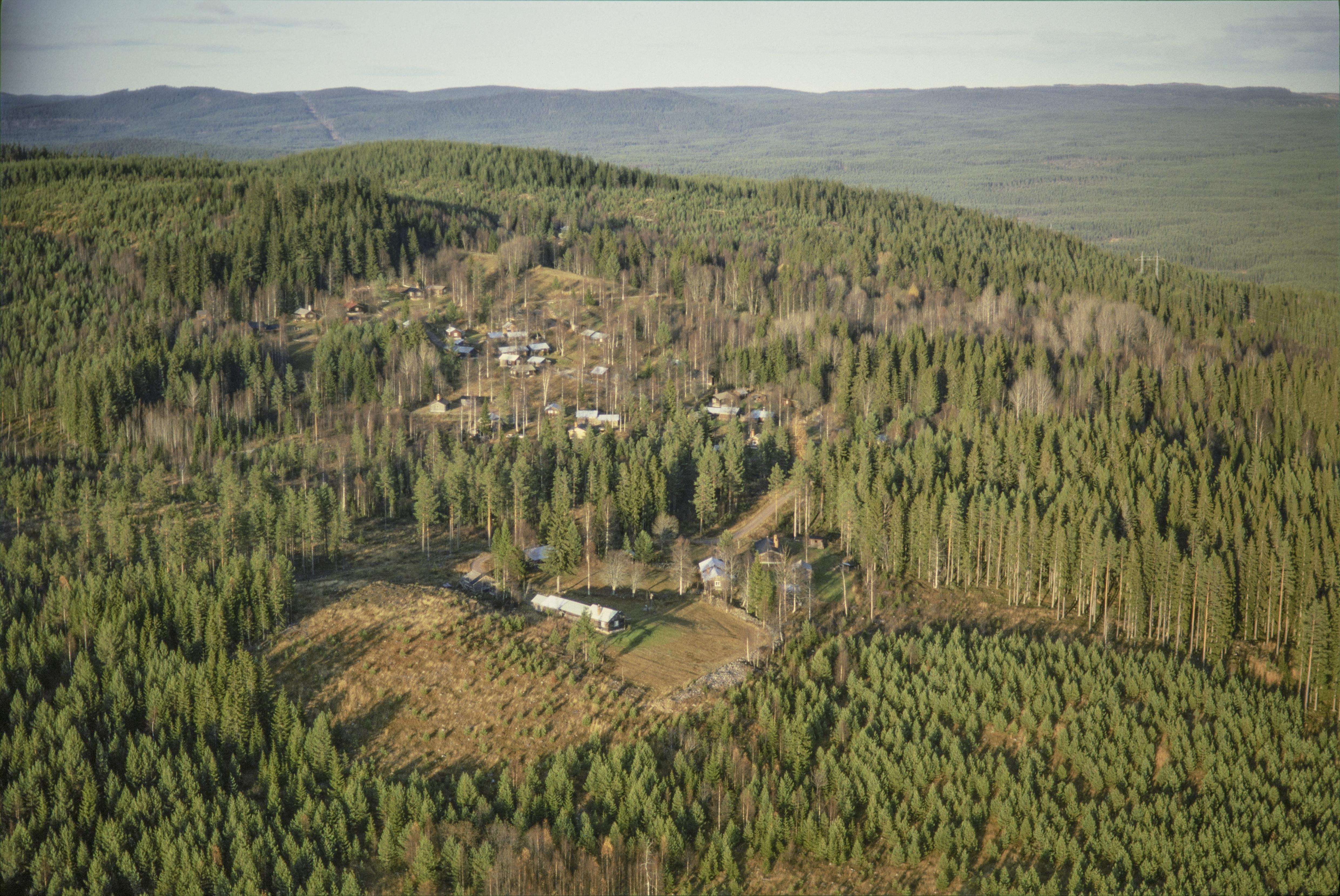 Beskrivning: Fäbodsbyn Övre Bjönsaberg (skrivs även Bönsaberg). Vid bildens mitt fäbodar med nummer 714, 713, 707, 709 m.fl. i södra delen av byn. Till vänster över bildens mitt ett härbre med ristningar RAÄnr Våmhus 16:2. Bilden är tagen mot (väderstreck): NO