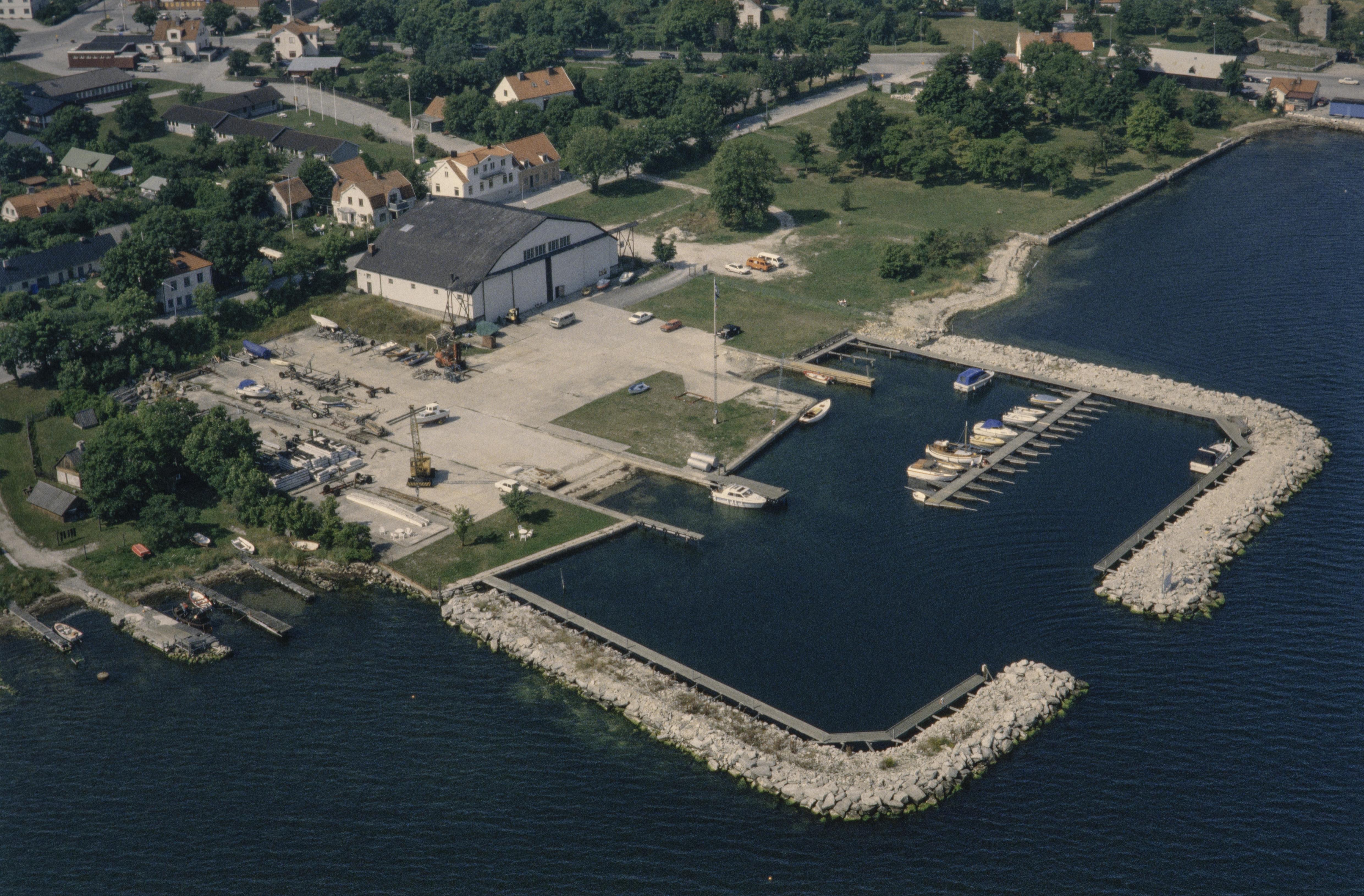 Beskrivning: Sjöflyghangaren i Fårösunds hamn. Uppe i vänstra hörnet bytomt RAÄnr Bunge 48:1. Bilden är tagen mot (väderstreck): NV