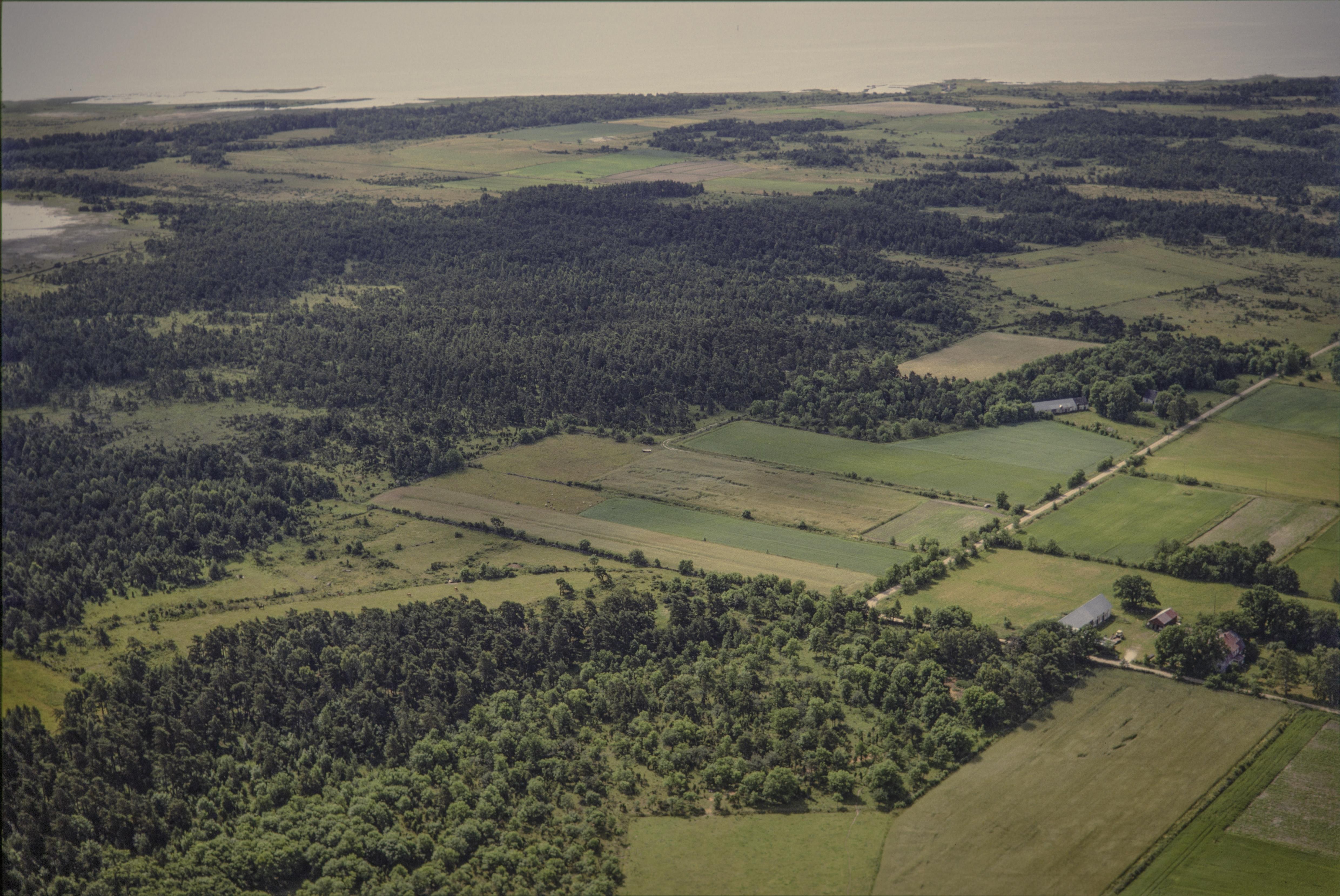 Beskrivning: Fornlämningsområdet Bandlundeviken. Området Strandhagen med gravfält RAÄnr Burs 50:1, stensättningar Burs 182:1-2 och stenar med slipyta Burs 180:1 m.fl. Näset Hummelbosholm i bildens övre del. Bilden är tagen mot (väderstreck): SO