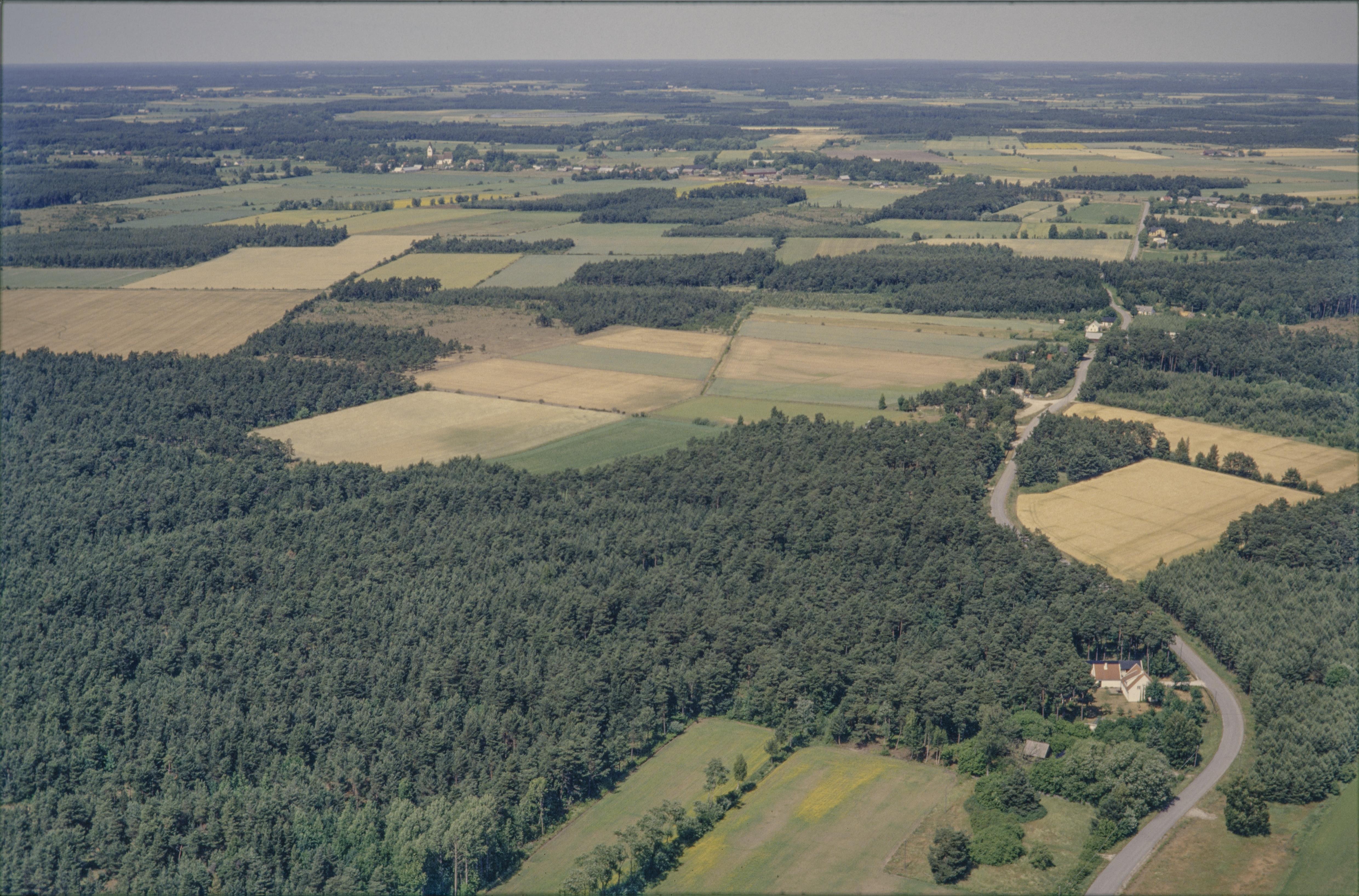 Beskrivning: I bildens nedre del området Bandlunde väster om Kärne by. Bandlunde kyrka och kyrkby uppe till vänster. Vid bildens mitt område med fyndplats (malstenar) RAÄnr Burs 131:1. Gränsen mot Rone socken mellan husen nere till höger. Bilden är tagen mot (väderstreck): NNV