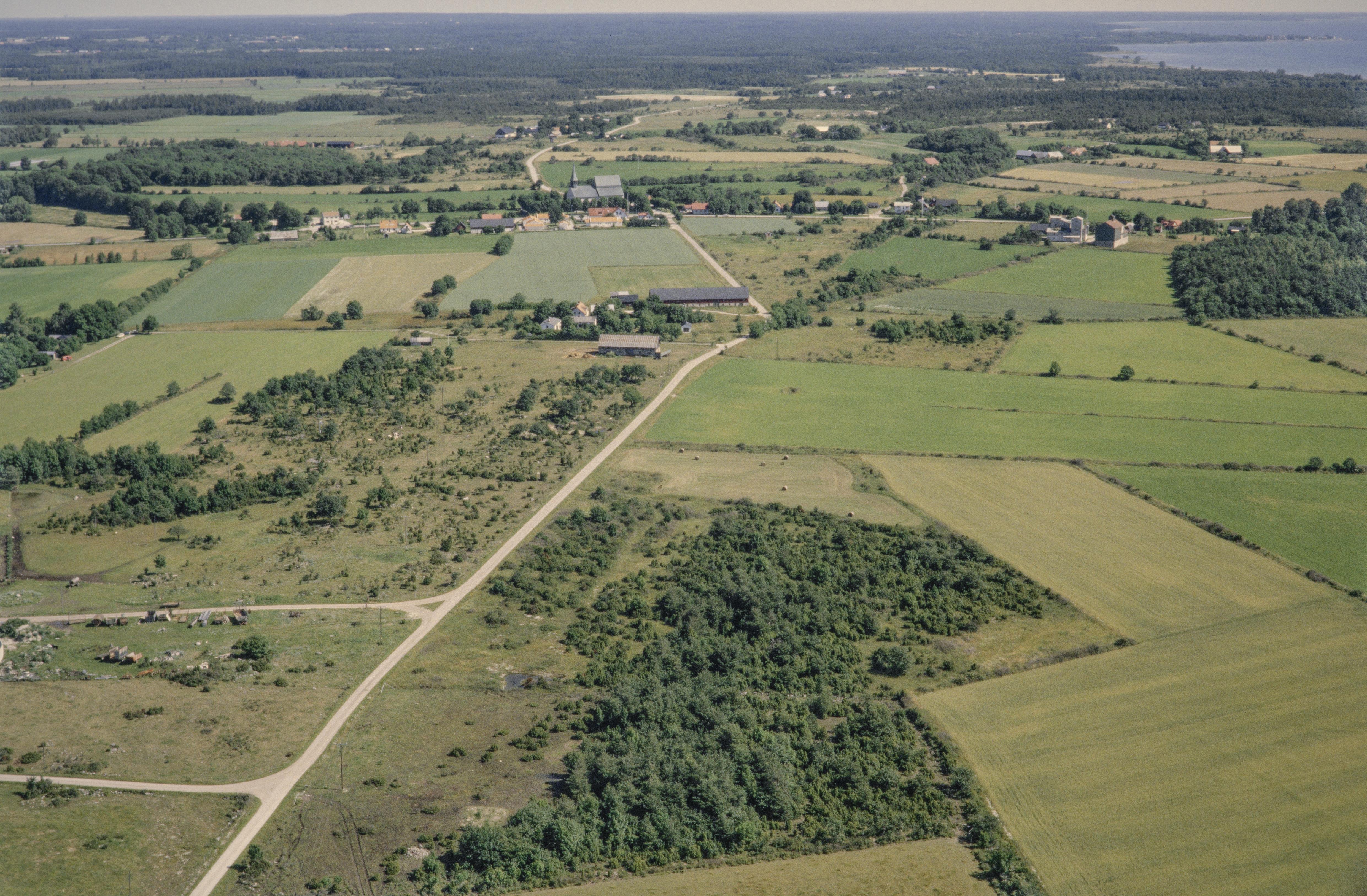 Beskrivning: Området Lausbackar. Till vänster i bildens nedre del gravfält RAÄnr Lau 7:1, stensättningar Lau 108:1-3 m.m. i området Gannor. Lau kyrka och kyrkby i bildens övre del. Bilden är tagen mot (väderstreck): NO