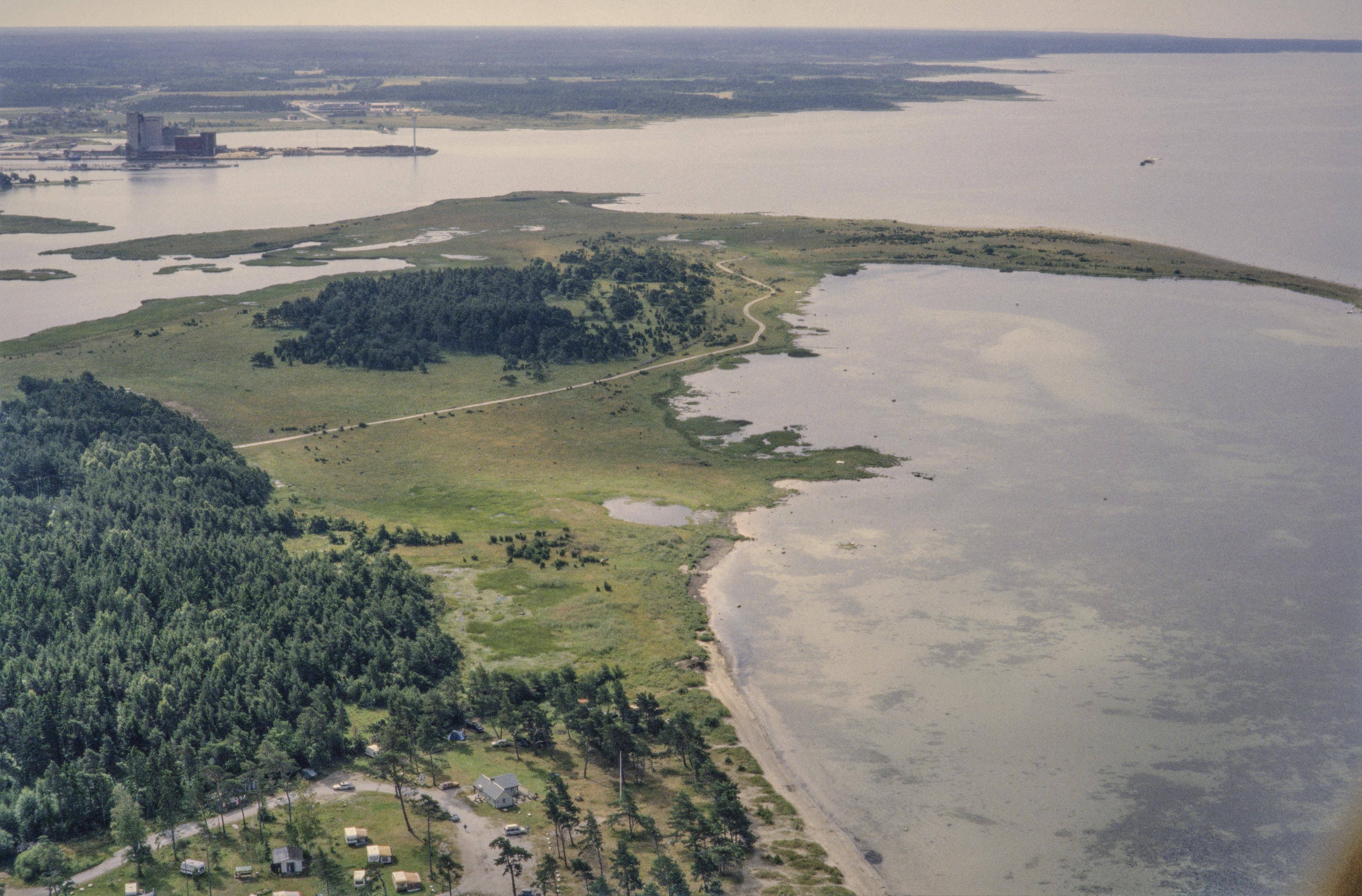 Beskrivning: Vivesholms befästningsområde RAÄnr Sanda 122:1-4 med lämningar efter borg, vallar, hamn m.m, Sandboviken uppe till vänster. Klinte socken i bildens övre kant. Bilden är tagen mot (väderstreck): SO