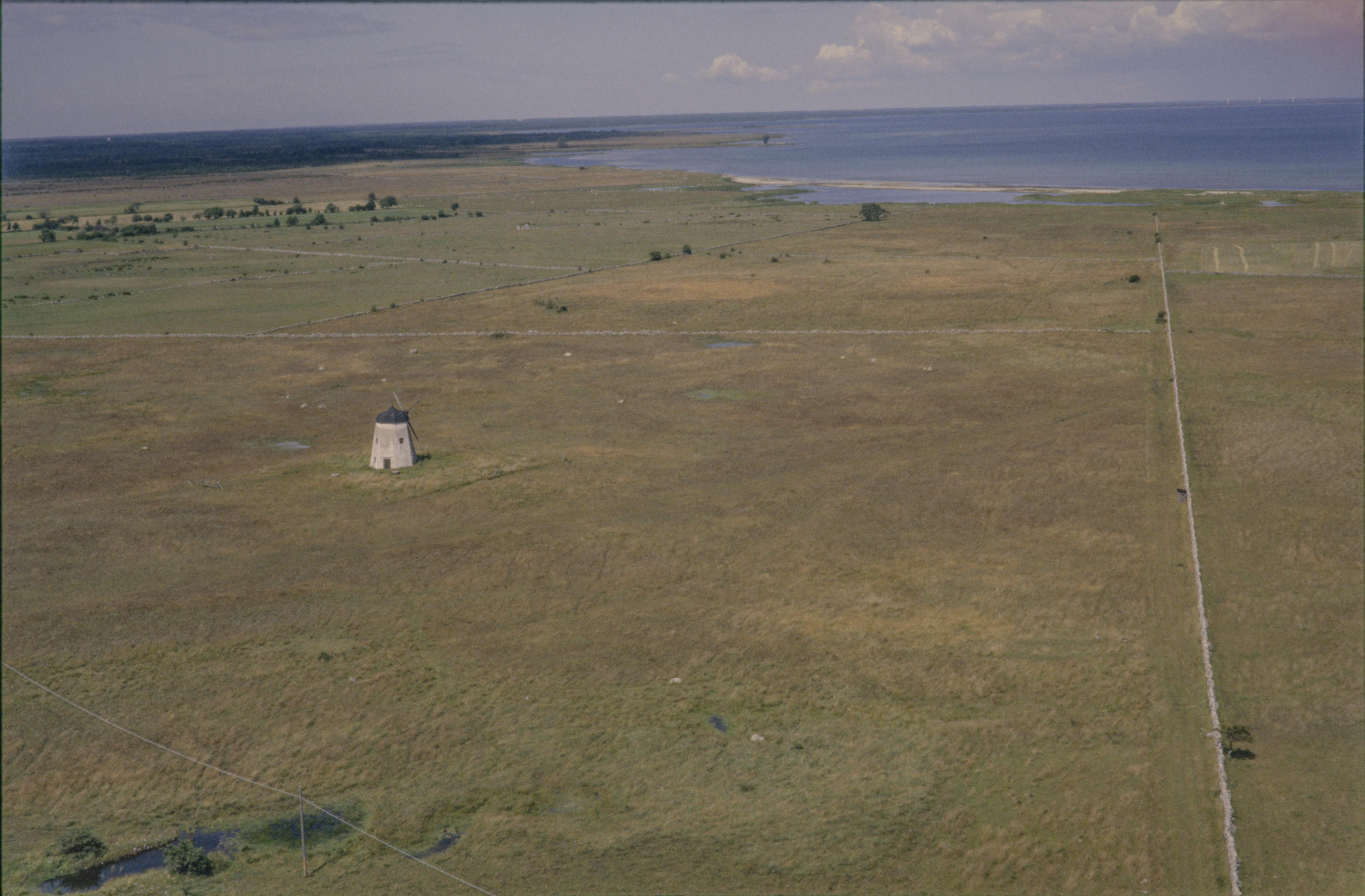 Beskrivning: Väderkvarn mellan gårdarna Barkarve och Burge i Faluddens nordvästra del. Till vänster över bildens mitt området Barkarve och en sten med ristning (slipränna) RAÄnr Öja 60:1. Bilden är tagen mot (väderstreck): NNO