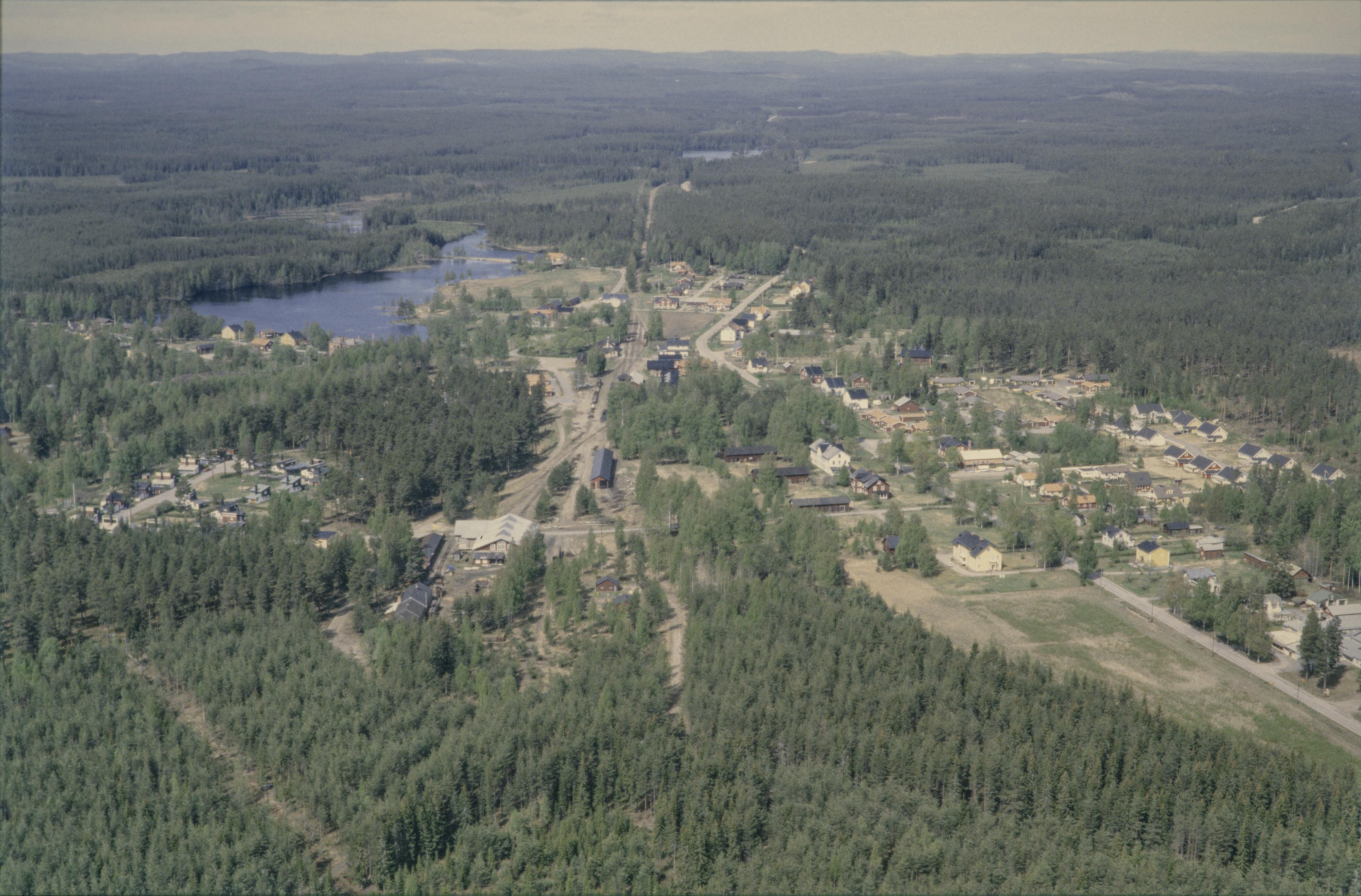 Beskrivning: Jädraås bruk vid Jädraån. Bruksherrgård, hytta, smedja, järnvägsstation m.m. Till vänster över bildens mitt ett område med fångstgropar RAÄnr Ockelbo 253:1, m.fl. Bilden är tagen mot (väderstreck): NV
