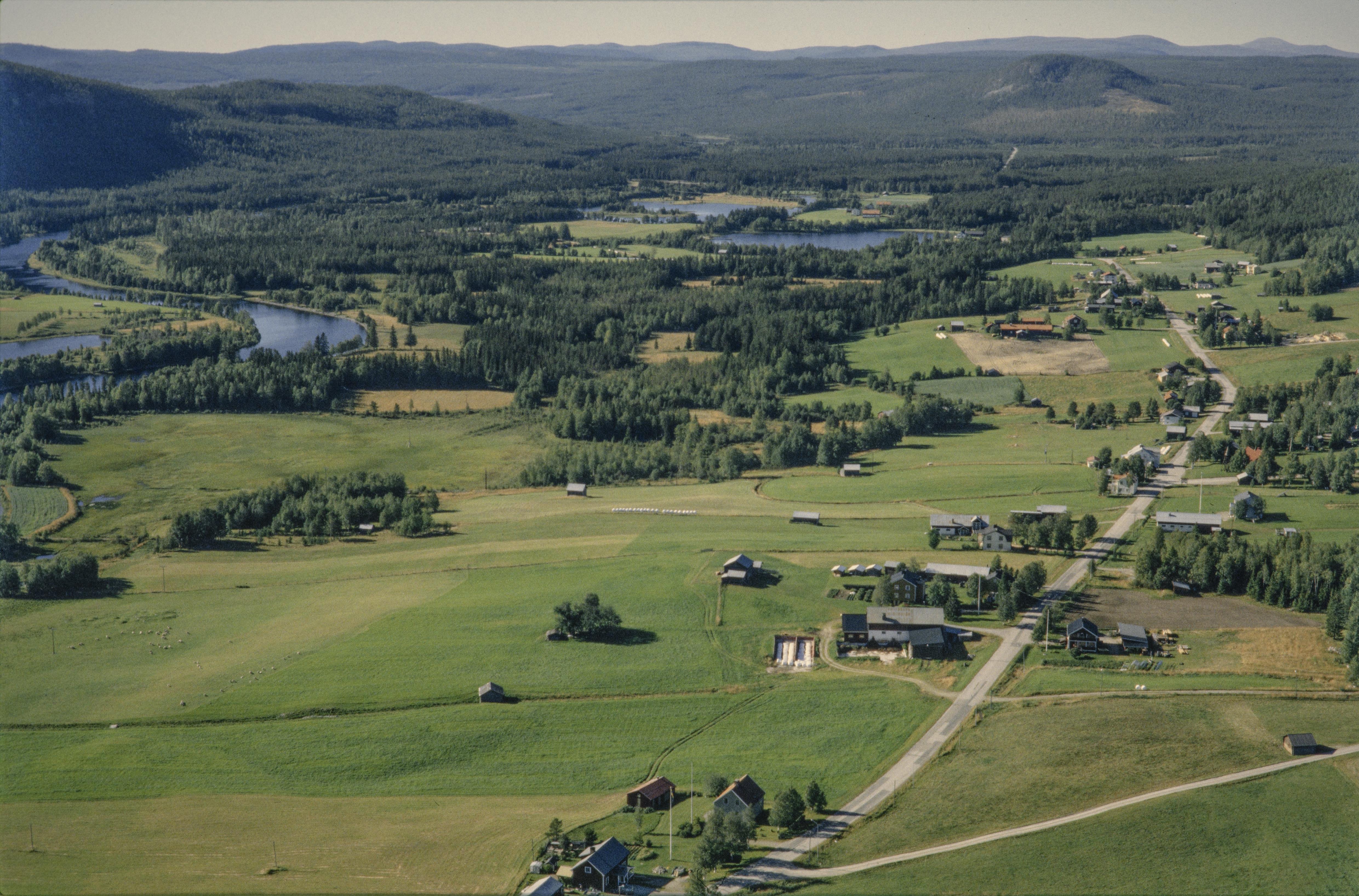 Beskrivning: Älven Ljusnans dalgång. Vid bildens mitt Långå by med fyndplats RAÄnr Hede 209:1. Över bildens mitt skymtas Långå skans RAÄnr Hede 6:1-3. Bilden är tagen mot (väderstreck): V