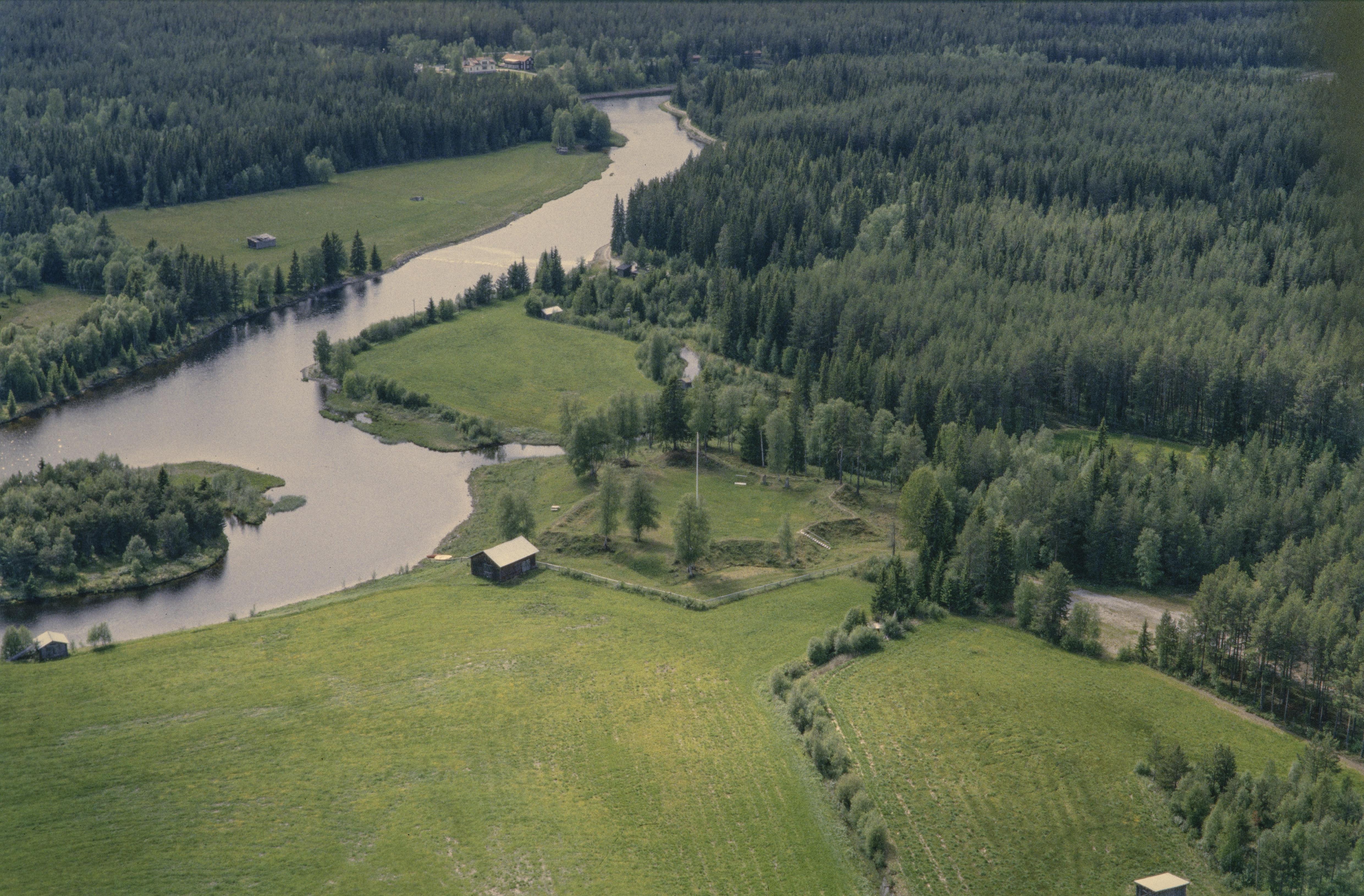 Beskrivning: Älven Ljusnan nordväst i Långå by. Vid bildens mitt Långå skans med minnesmärke RAÄnr Hede 6:1-3. Bilden är tagen mot (väderstreck): SV
