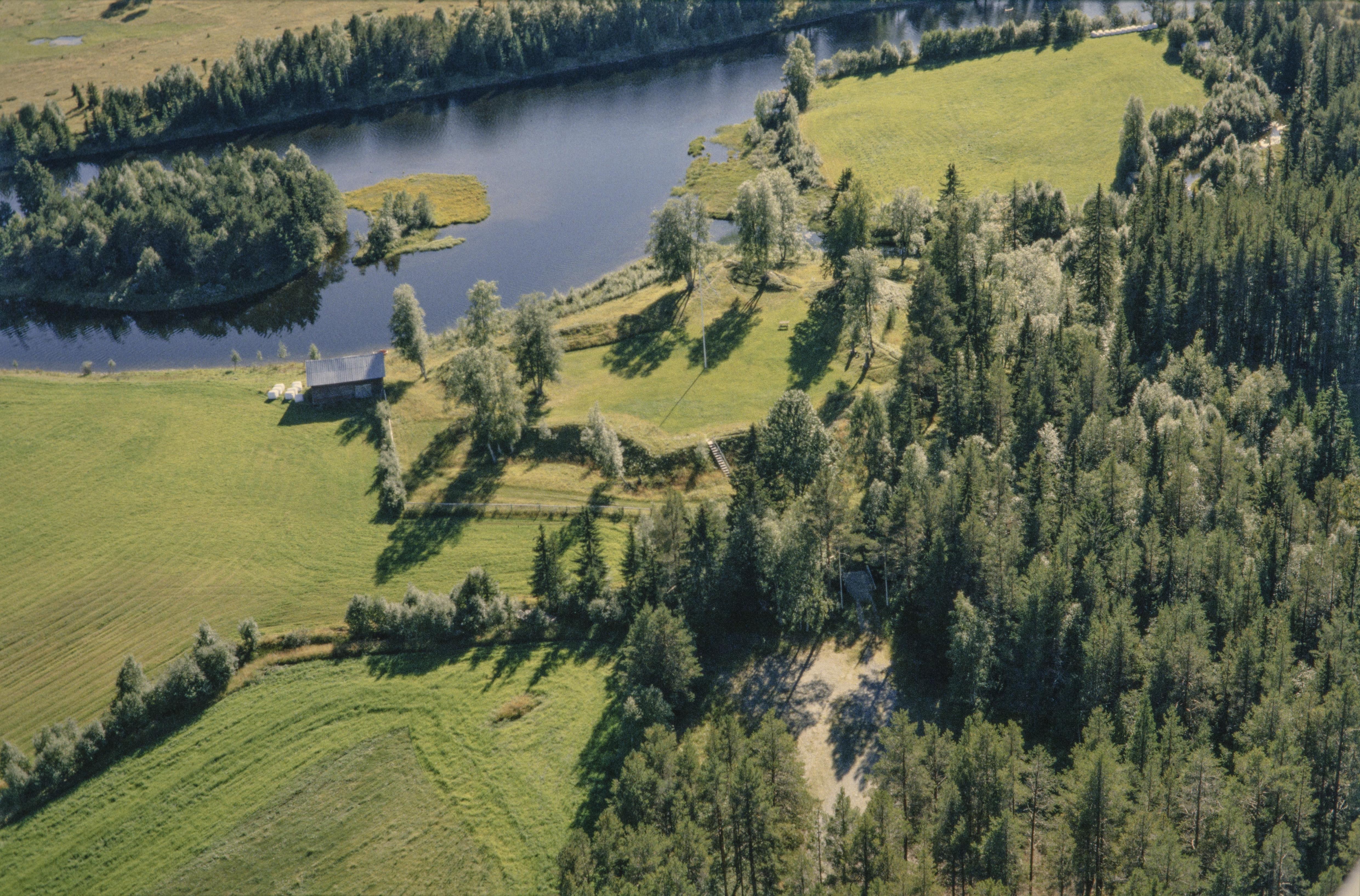 Beskrivning: Älven Ljusnan nordväst i Långå by. Vid bildens mitt Långå skans med minnesmärke RAÄnr Hede 6:1-3. Bilden är tagen mot (väderstreck): S