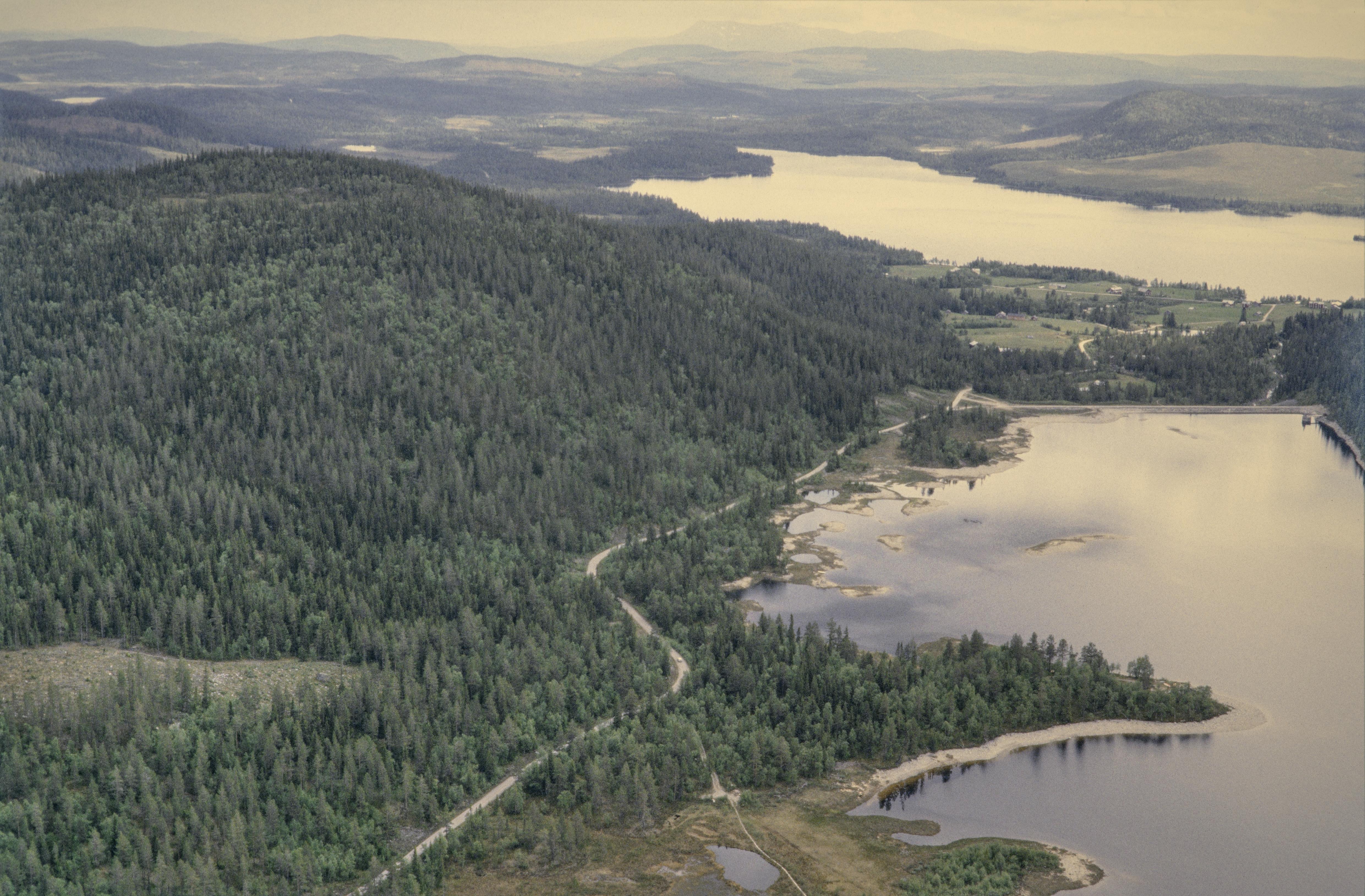 Beskrivning: Över-Särvsjön med härdar, boplatser m.m. på norra och östra sidan. Grannberget med hällmålning RAÄnr Hede 201:1 uppe till vänster. Under bildens mitt boplats RAÄnr Hede 258:1-4 m.fl. Uppe till höger Grannbergets by vid Neder-Särvsjön. Bilden är tagen mot (väderstreck): S