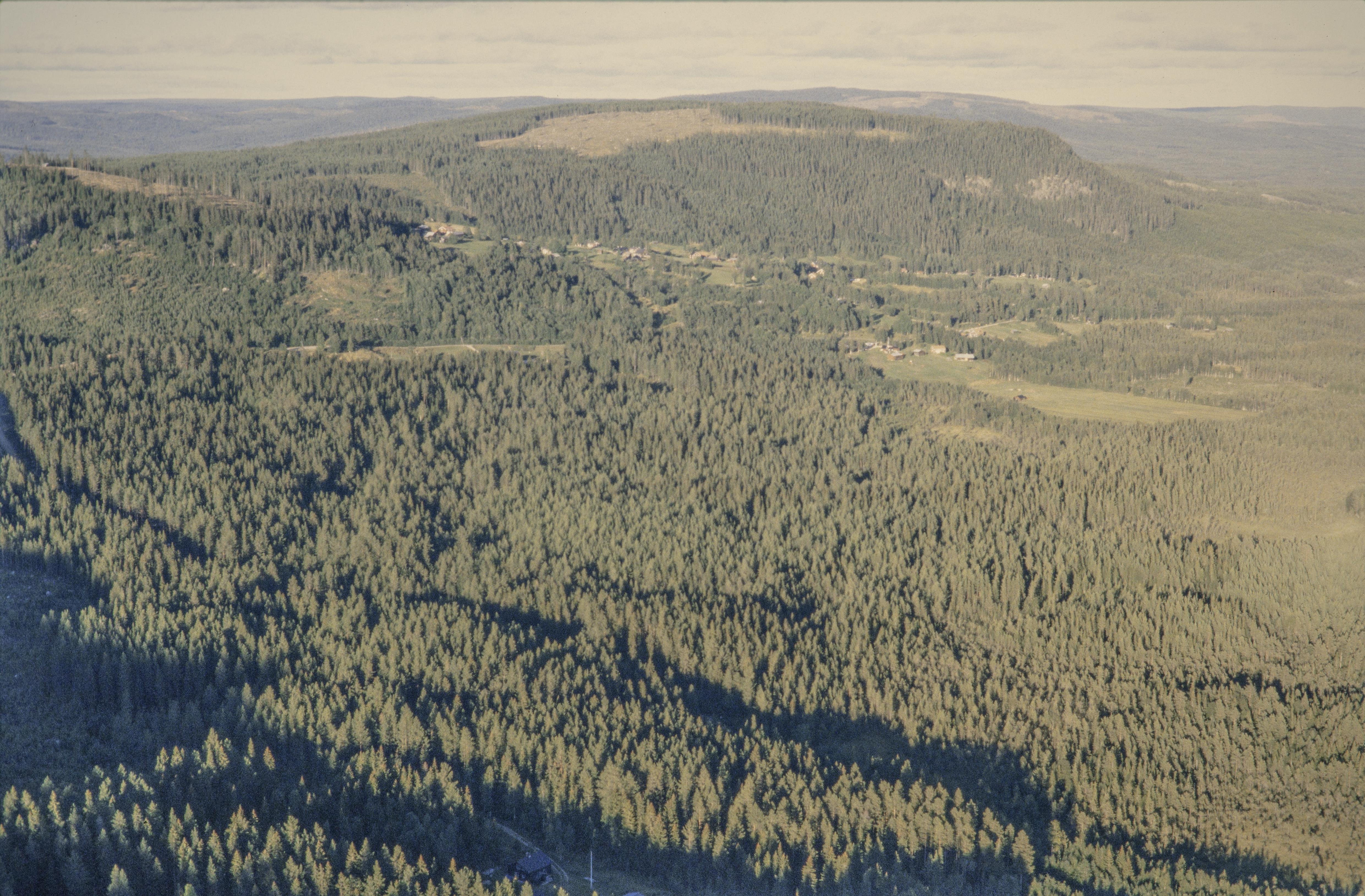 Beskrivning: Över bildens mitt Duvbergs by med bytomter RAÄnr Sveg 1784, 1786, 1790, 1793,m.fl, I bildens övre del berget Duvbergshammaren. Bilden är tagen mot (väderstreck): NO