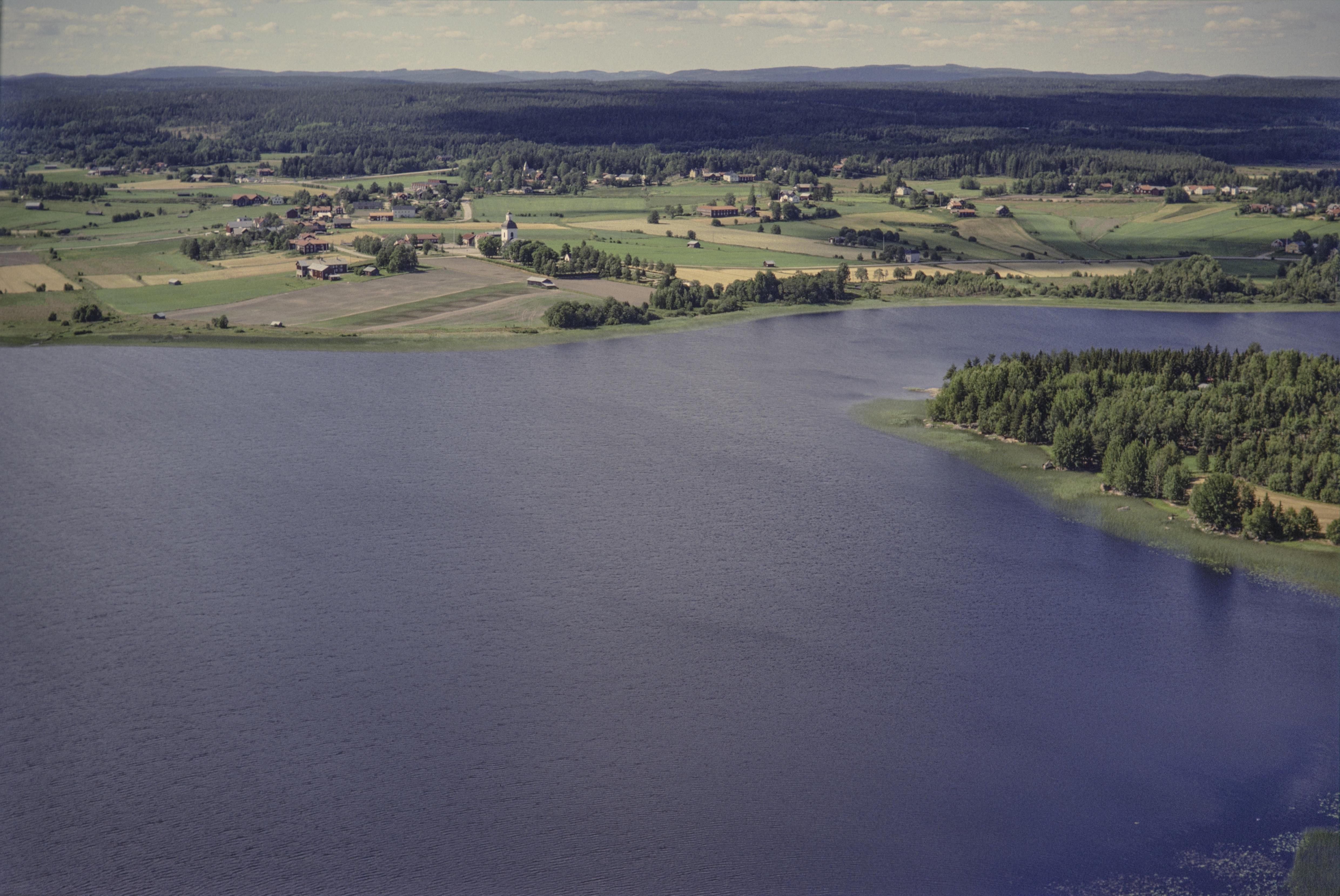 Beskrivning: Jättendals kyrkby vid Jättendalssjön. Jättendals kyrka till vänster över bildens mitt. På udden till höger grav- och boplats RAÄnr Jättendal 45:1. Bilden är tagen mot (väderstreck): NV