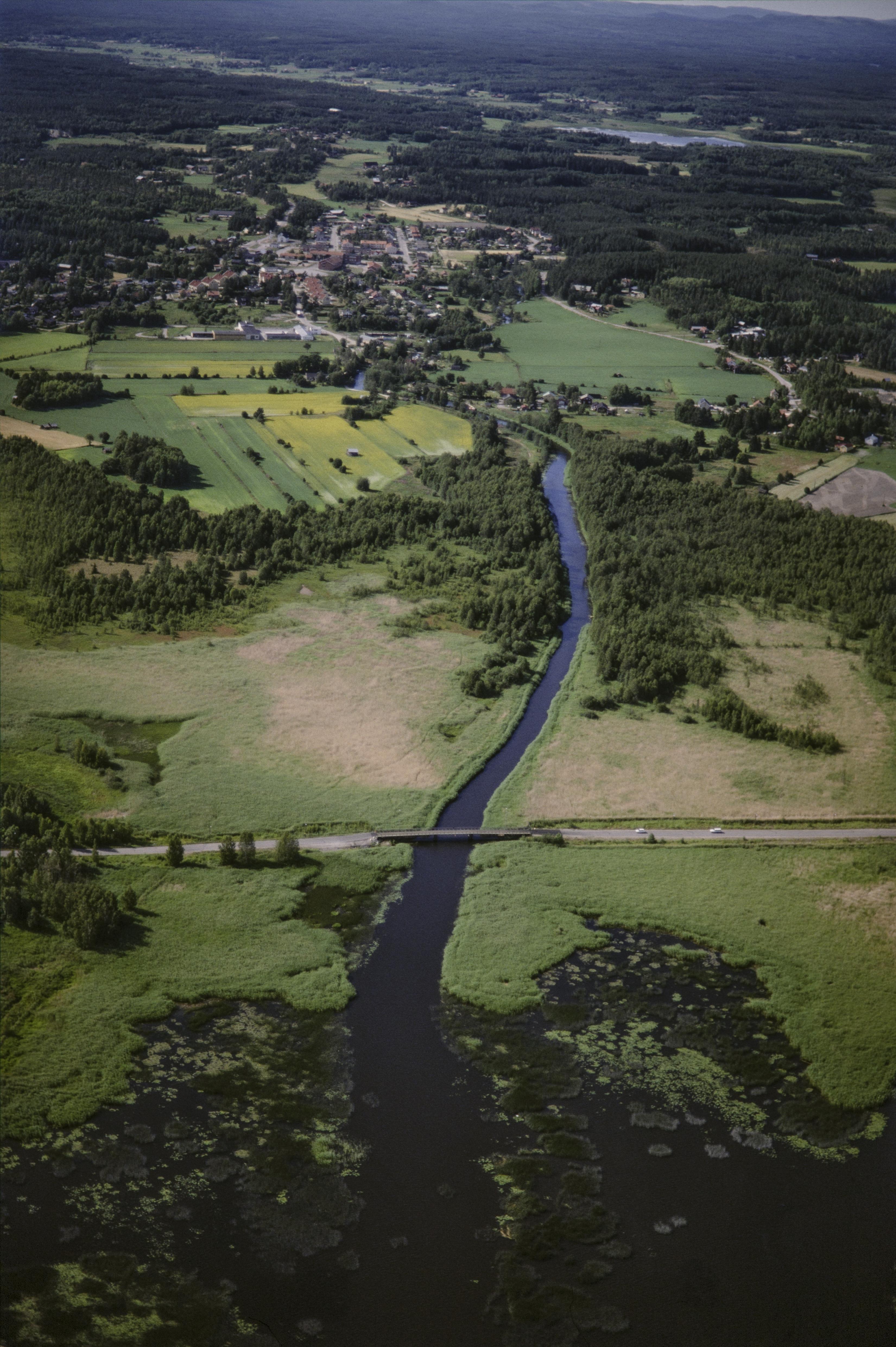 Beskrivning: Lötåns dalgång. I bildens nedre del Lötåns mynning i sjön Flaket. I bildens övre del Vågbro tätort. Till vänster om bildens mitt stensättning RAÄnr Norrala 85:1. Bilden är tagen mot (väderstreck): NV