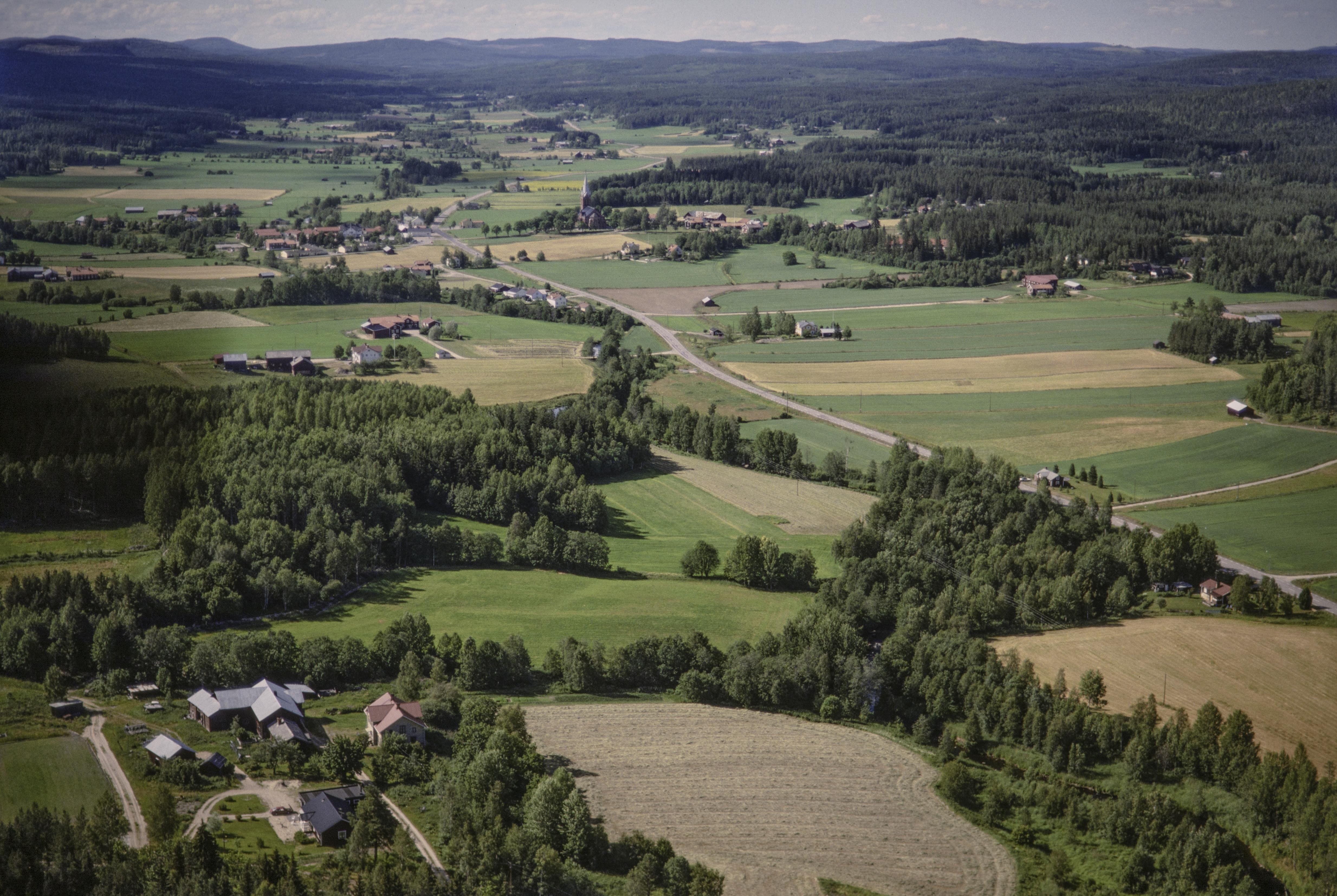 Beskrivning: Trönö kyrkby i Trönöåns dalgång. Nere i bildens vänstra hörn Orsten gård med plats för tradition, RAÄnr Trönö 59:1. Trönö nya kyrka i bildens övre del. Bilden är tagen mot (väderstreck): NV