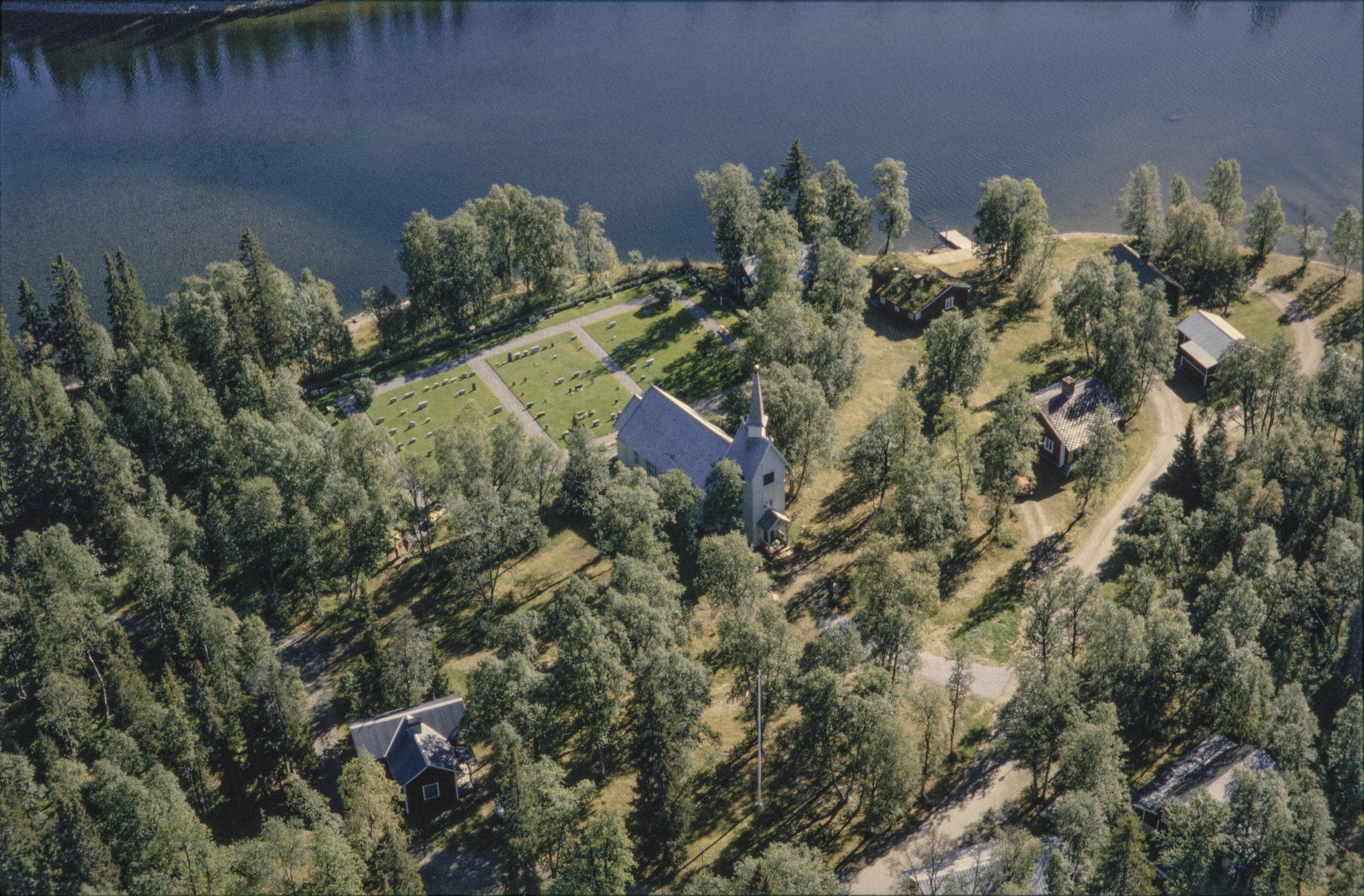 Beskrivning: Ankarede by / kyrkby vid Lejarälven och Stor-Blåsjön (Plaavere). Ankarede kapell vid bildens mitt. Bilden är tagen mot (väderstreck): SSO