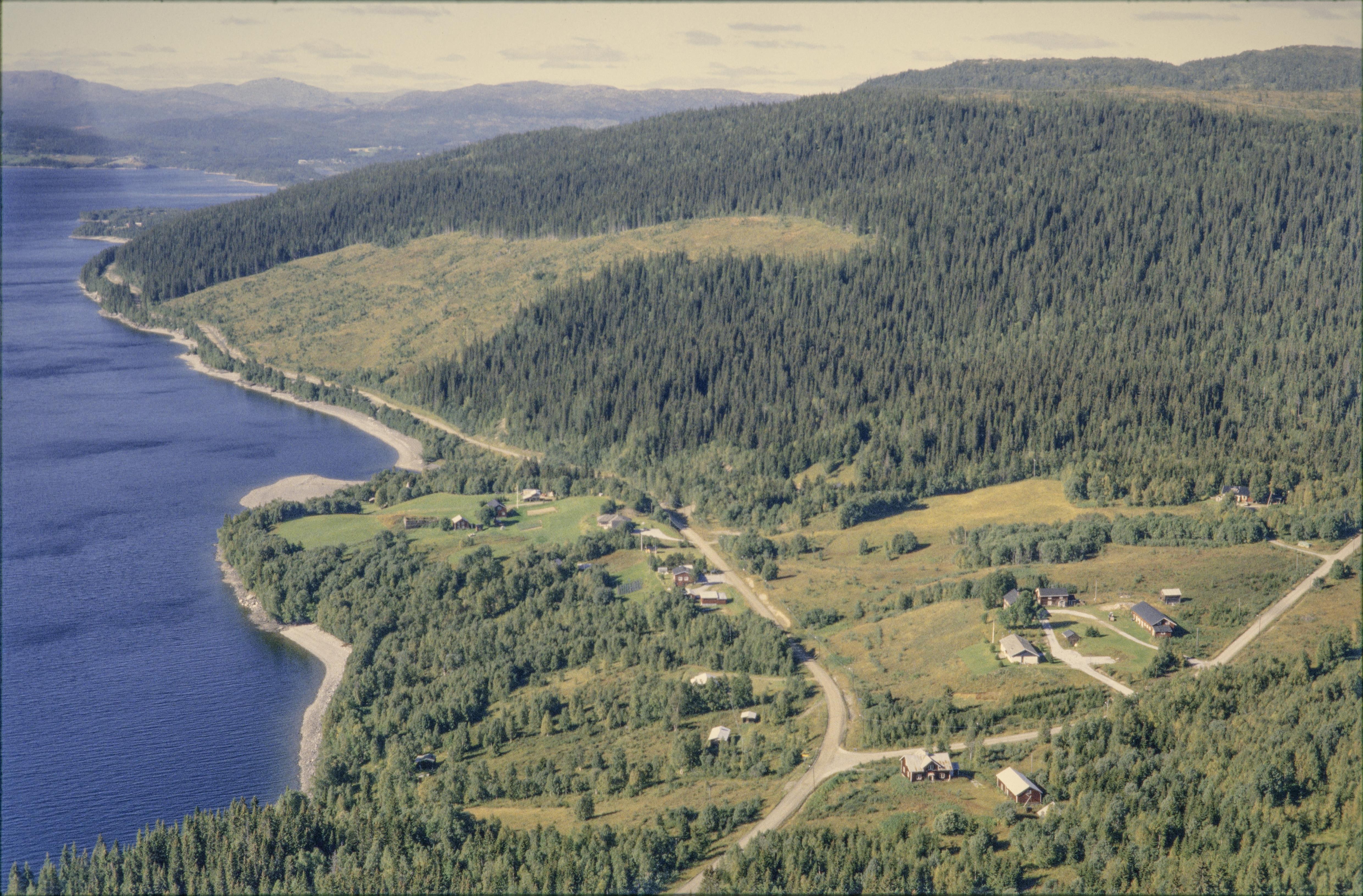 Beskrivning: Kyrkbyn Viken under Vikbergen i norra delen av Kvarnbergsvattnet i Ströms Vattudal. Vid bildens mitt Vikens kapell i boplats RAÄnr Frostviken 137:1 vid röse Frostviken 139:1. Bilden är tagen mot (väderstreck): V