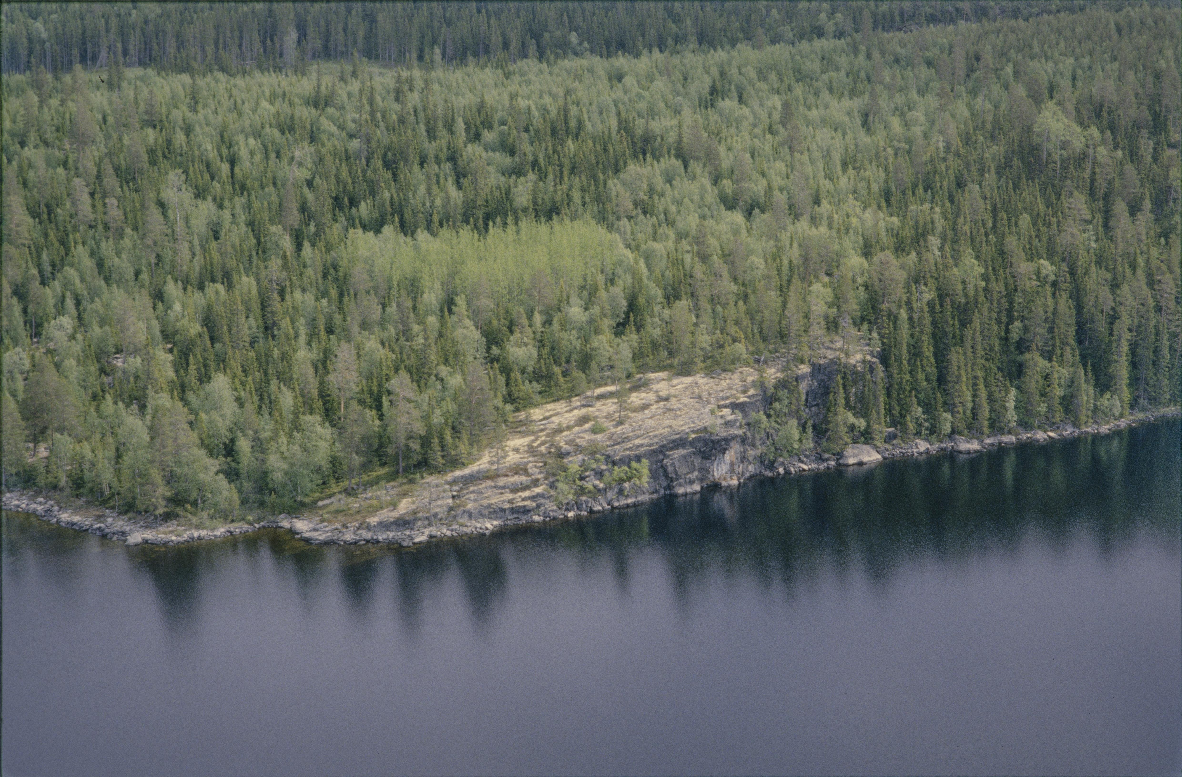 Beskrivning: Skärvångssjön norrväst om byn Norra Skärvången. Vid bildens mitt hällmålning RAÄnr Föllinge 346:1 vid Brattberget under Norsjöberget. Uppe till vänster boplats RAÄnr Föllinge 175:1. Bilden är tagen mot (väderstreck): NO