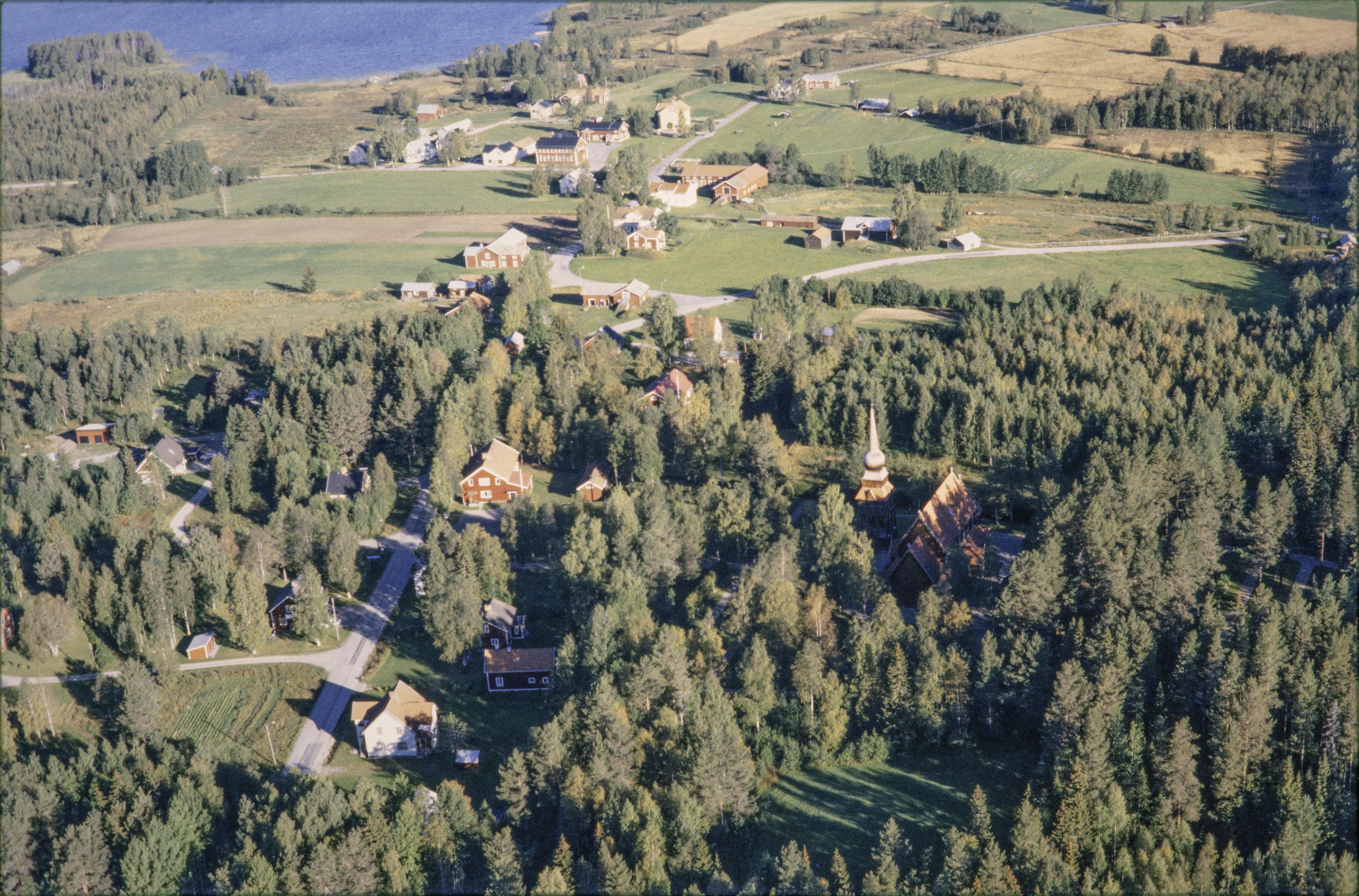 Beskrivning: Västanede by. Håsjö kyrka (Håsjö nya kyrka) under bildens mitt. Hemsjön i bildens övre del. Bilden är tagen mot (väderstreck): NNV