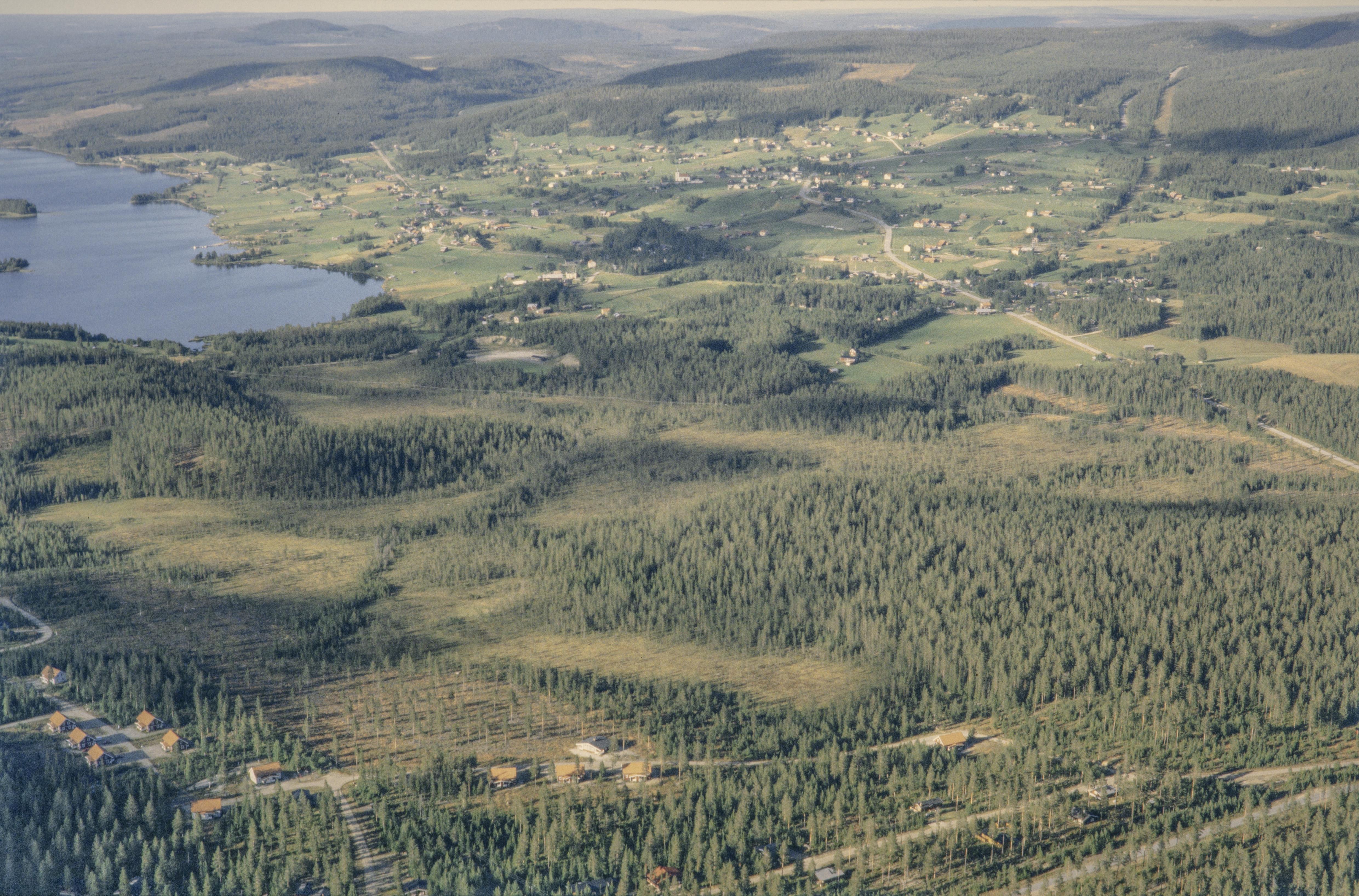 Beskrivning: Klövsjö kyrkby vid Klövsjön. Klövsjö kyrka över bildens mitt. I bildens nedre del Stamabäckmyrarna. Till vänster om bildens mitt blästbrukslämning RAÄnr Klövsjö 30:1. Bilden är tagen mot (väderstreck): NNO