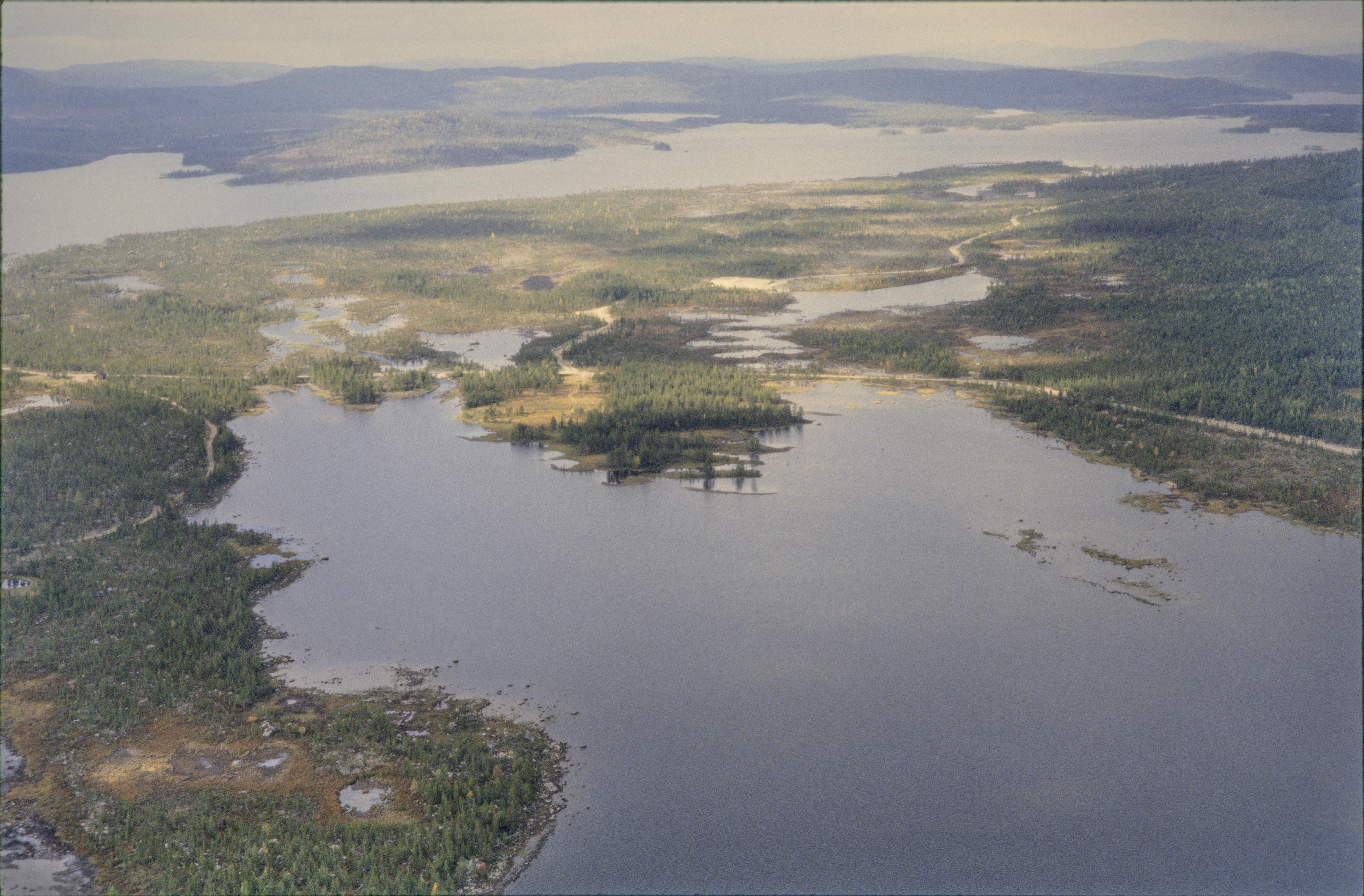 Beskrivning: Området Jilggismuotkke mellan sjöarna Gallajaure (Gállájávvre) och i bildens övre del Stor-Mattaure (Stuor Máttávrre). I viken till höger om bildens mitt kolningsanläggning RAÄnr Arjeplog 3782 m.fl. Över bildens mitt boplats RAÄnr Arjeplog 185:1 vid ett rengärde. Bilden är tagen mot (väderstreck): VNV