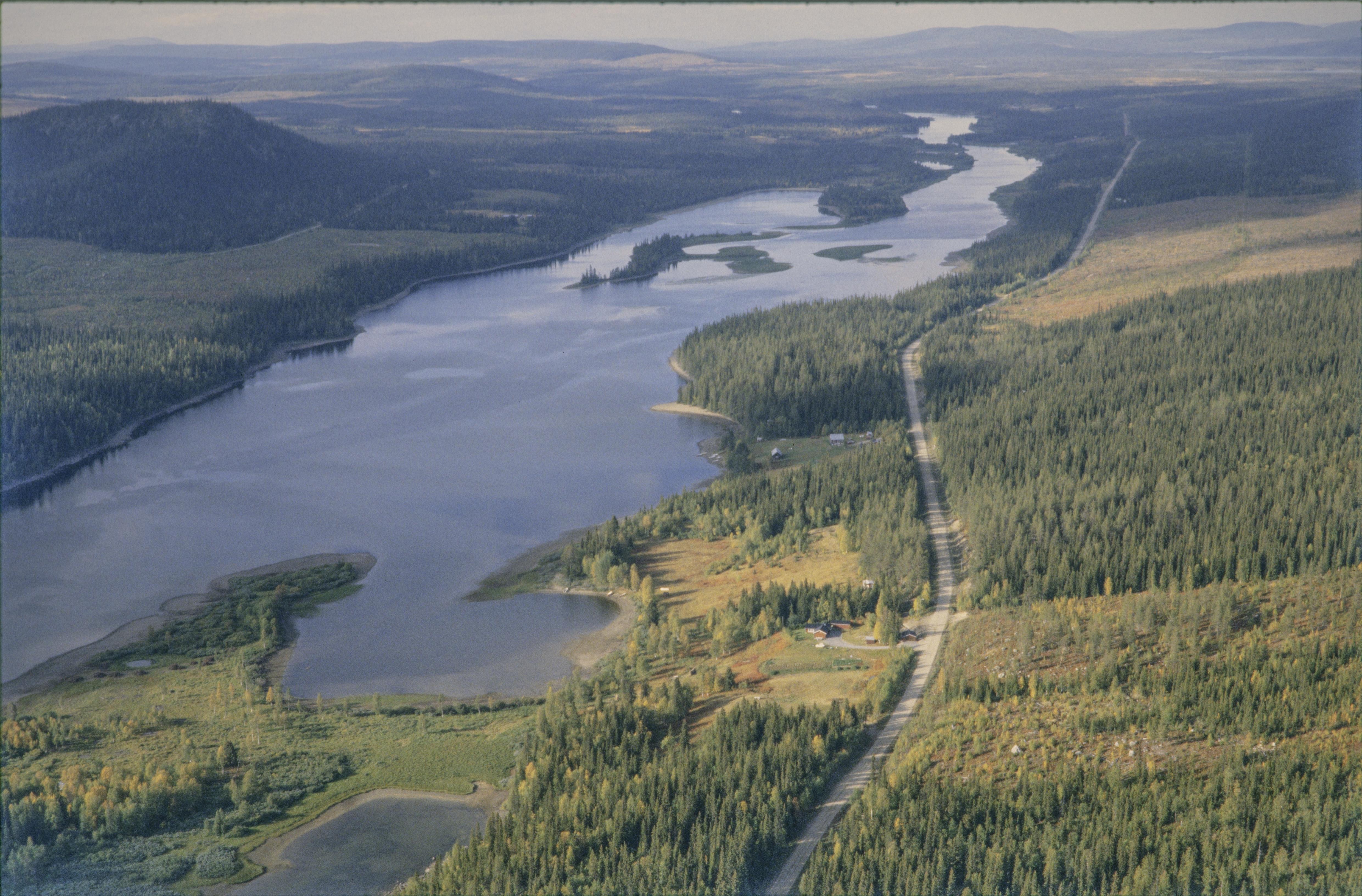 Beskrivning: Laisälven (Lájsso) vid byn Persbacka. Vid stranden vid bildens mitt boplats RAÄnr Arjeplog 603:1-2. Bilden är tagen mot (väderstreck): NV