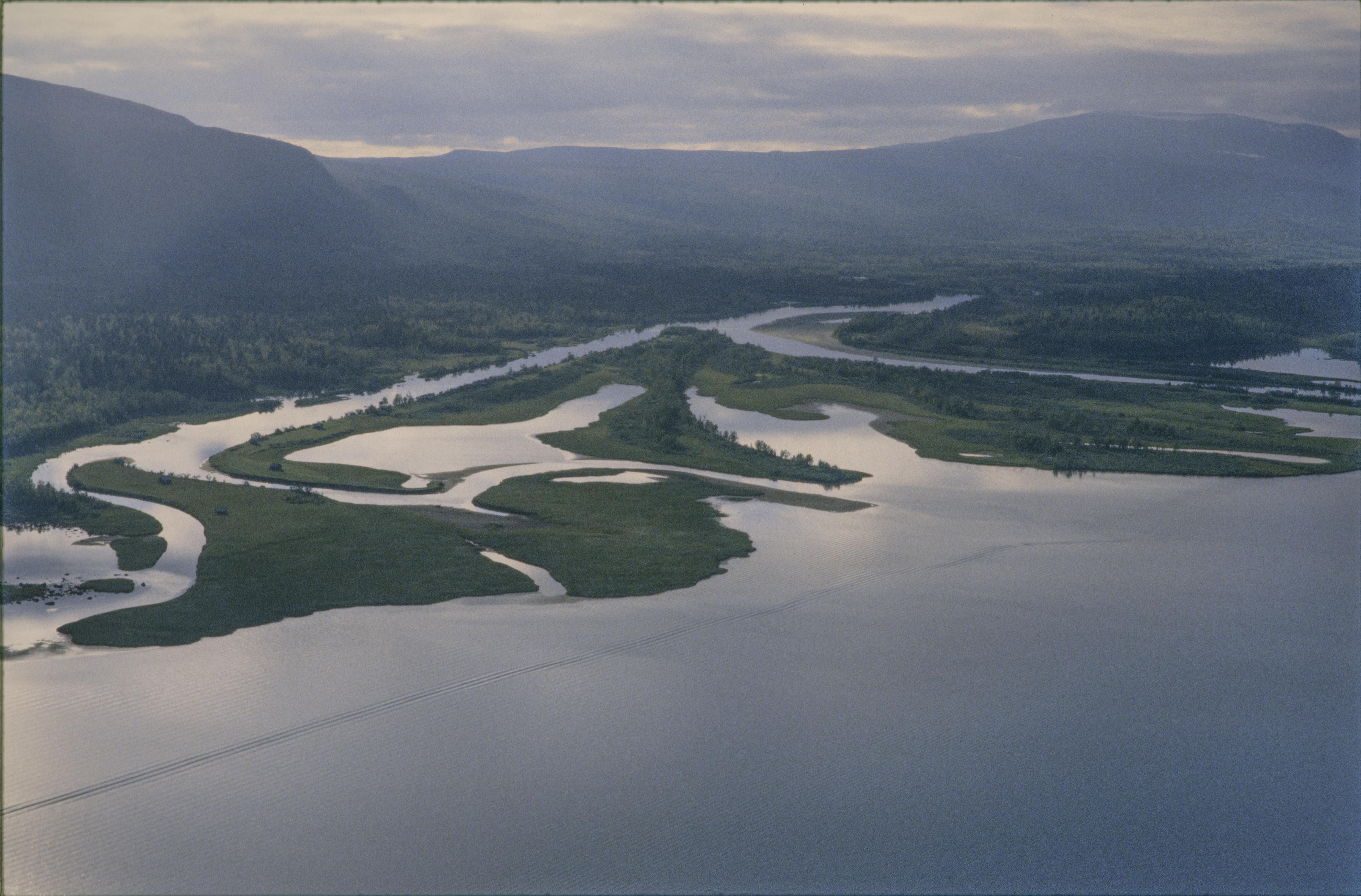 Beskrivning: Till höger över bildens mitt byn Bäverholmen (Vaddnemsuolo). I bildens nedre del området Yrafdeltat (skrivs även Irafdeltat) där Laisälven (Lájsso) rinner in i sjön Iraft (Yraft). Till höger om bildens mitt härd RAÄnr Arjeplog 564:1. Bilden är tagen mot (väderstreck): SV