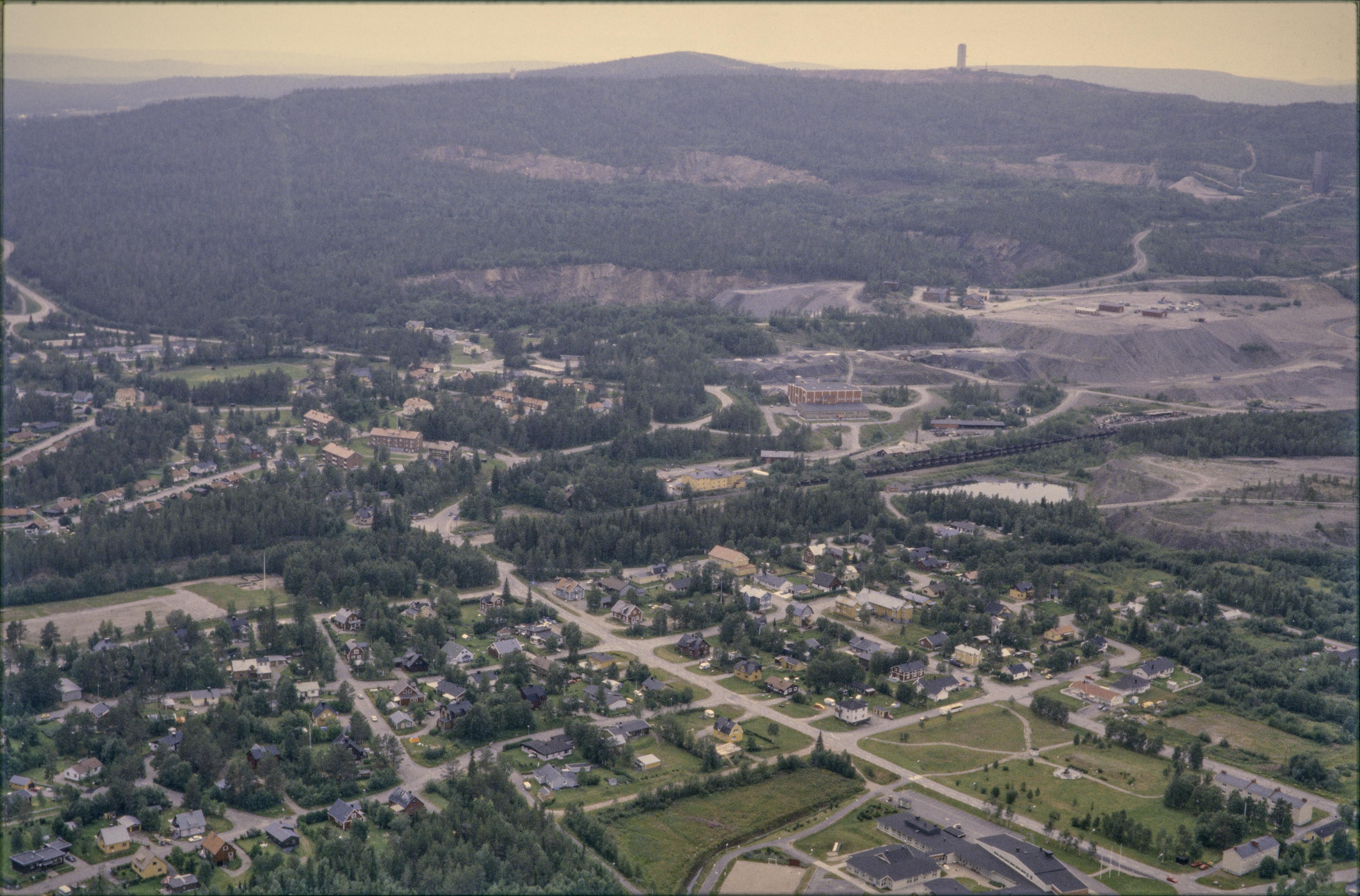 Beskrivning: Koskullskulle tätort, stationssamhälle och gruvsamhälle vid Linaälven (Lijnáädno). I bildens övre del gruvområden RAÄnr Gällivare 2515 i tätorten Malmberget. Bilden är tagen mot (väderstreck): V