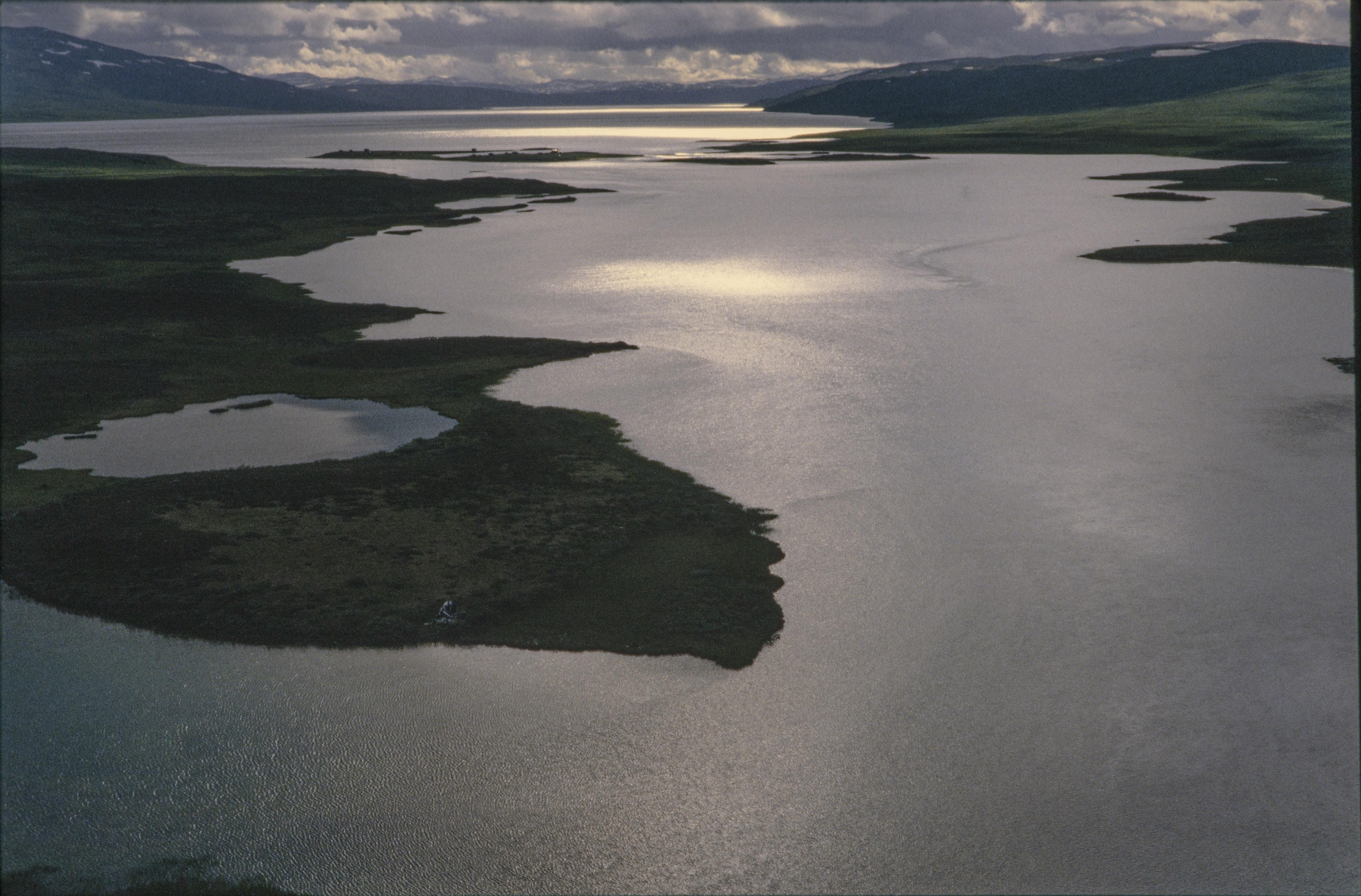 Beskrivning: Ån Vuojatätno (Vuojatädno). I bildens övre del holmen Gievgessuoloj och sjön Vastenjaure (Vásstenjávrre). Området ingår i Padjelanta (Badjelánnda) nationalpark och världsarvet Laponia. Bilden är tagen mot (väderstreck): VSV