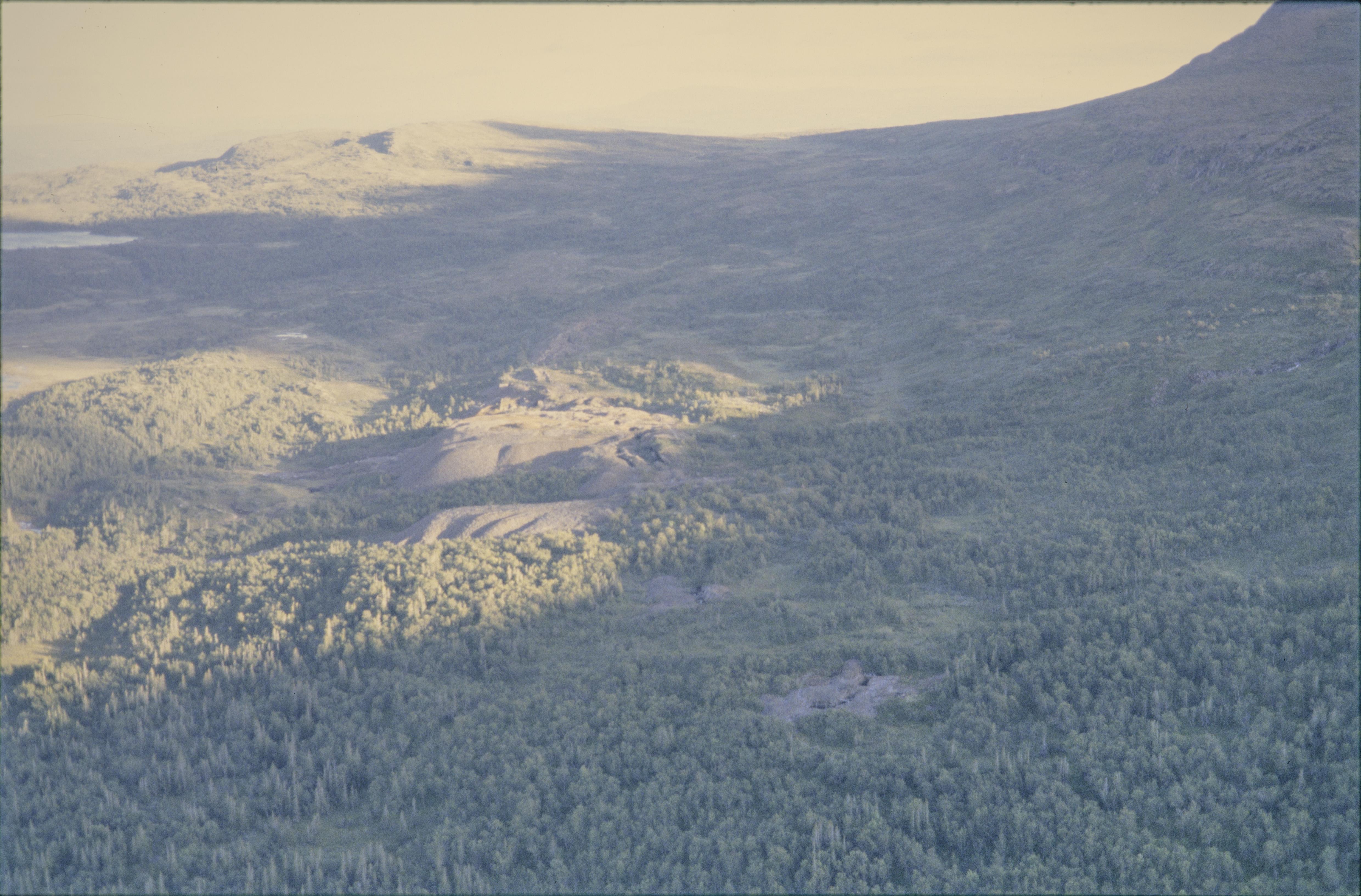 Beskrivning: Fjällområdet Åreskutan, norra delen. I fjällsidan vid bildens mitt gruvområdet Bjelkes gruvor (skrivs även Bielkes gruvor) RAÄnr Kall 39:1. Över bildens mitt (längs fjällkanten) går gränsen mot socknet Åre. Bilden är tagen mot (väderstreck): SO