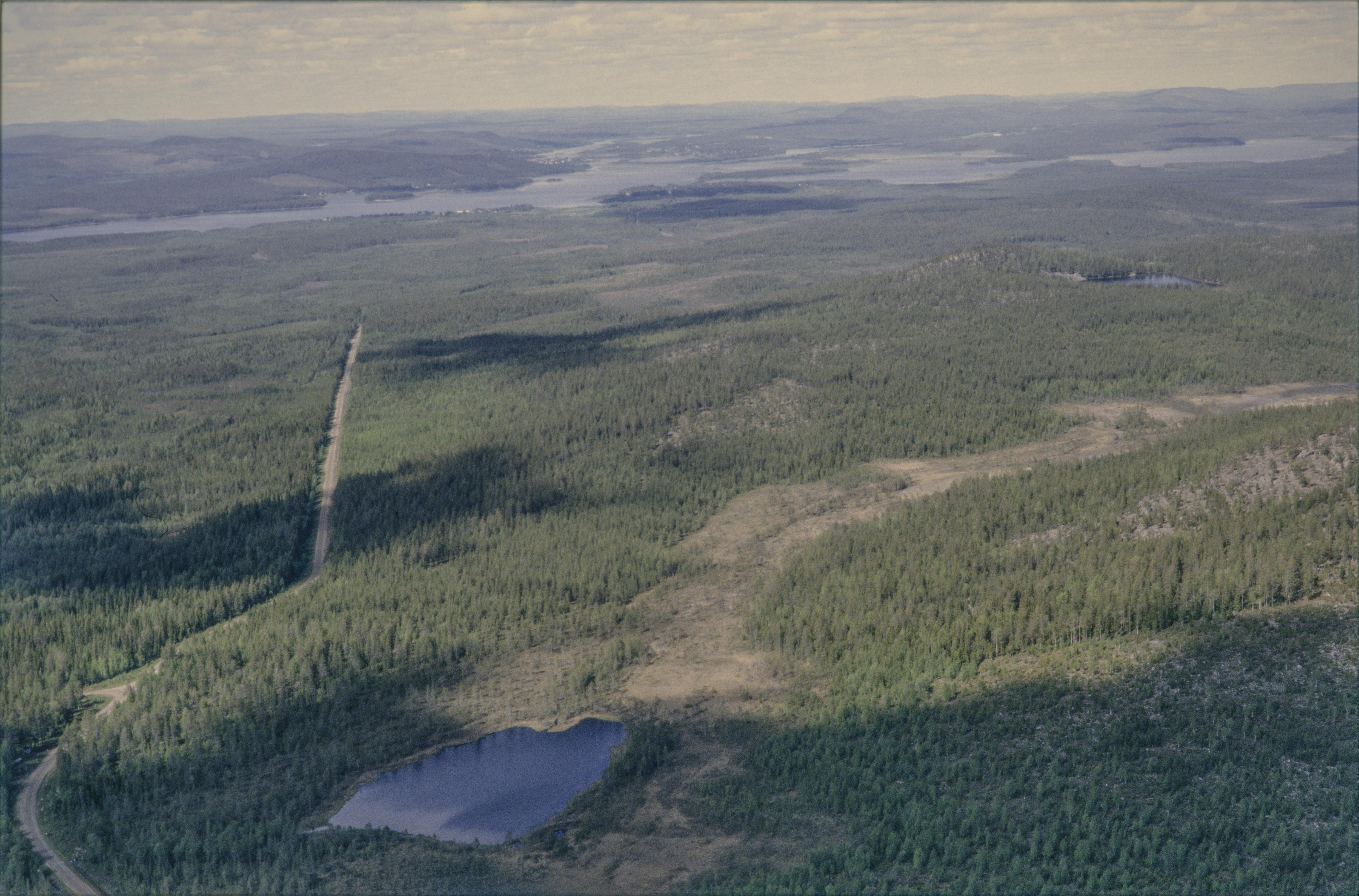 Beskrivning: Området Slättåsen vid Slättåsberget. Under bildens mitt sameviste med rengärden. Slättåstjärnen nere till vänster. Boplatsgrop RAÄnr Överkalix 533:1 vid skogsvägen uppe till vänster. Sjön Djupträsket och Kalixälven i bildens övre del. Bilden är tagen mot (väderstreck): NV