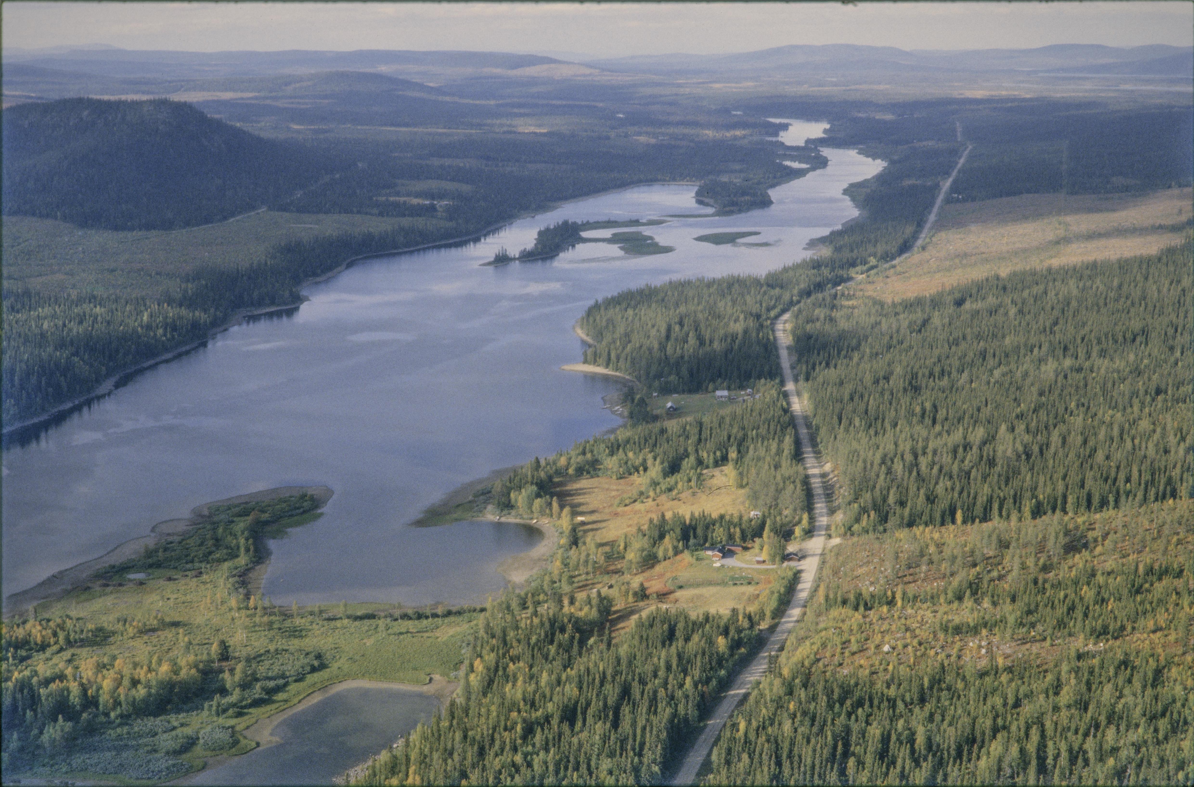 Beskrivning: Laisälven (Lájsso) vid byn Persbacka. Vid stranden vid bildens mitt boplats RAÄnr Arjeplog 603:1-2. Bilden är tagen mot (väderstreck): NV