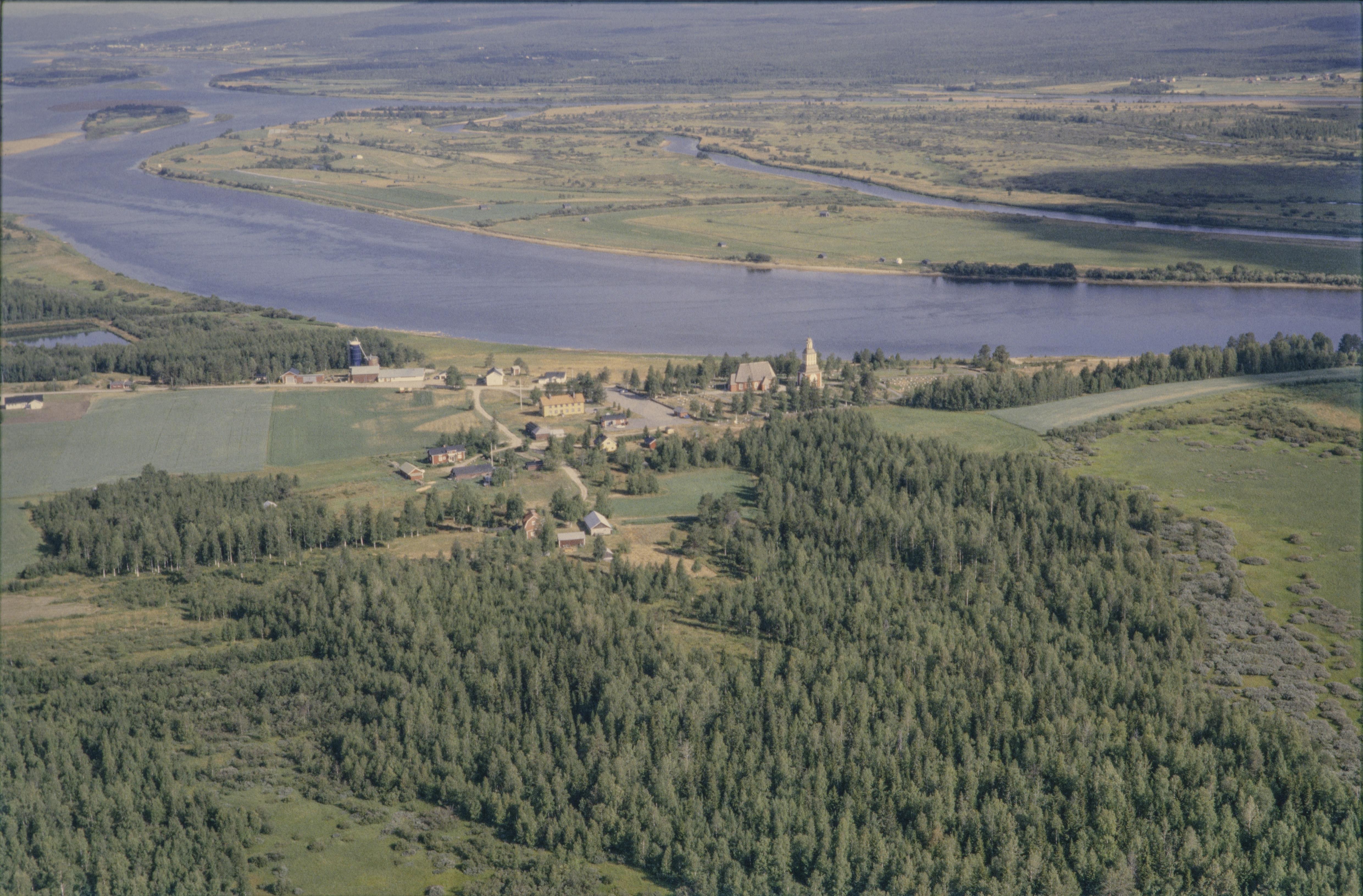 Beskrivning: Hietaniemi kyrkby i orten Hedenäset vid Torneälven i Tornedalen. Hietaniemi kyrka vid bildens mitt. Vid kyrkan bytomt RAÄnr Hietaniemi 326:1, gränsmärke Hietaniemi 61:1, m.m. Torneälven markerar riksgränsen mot Finland (i bildens övre del). Bilden är tagen mot (väderstreck): NO