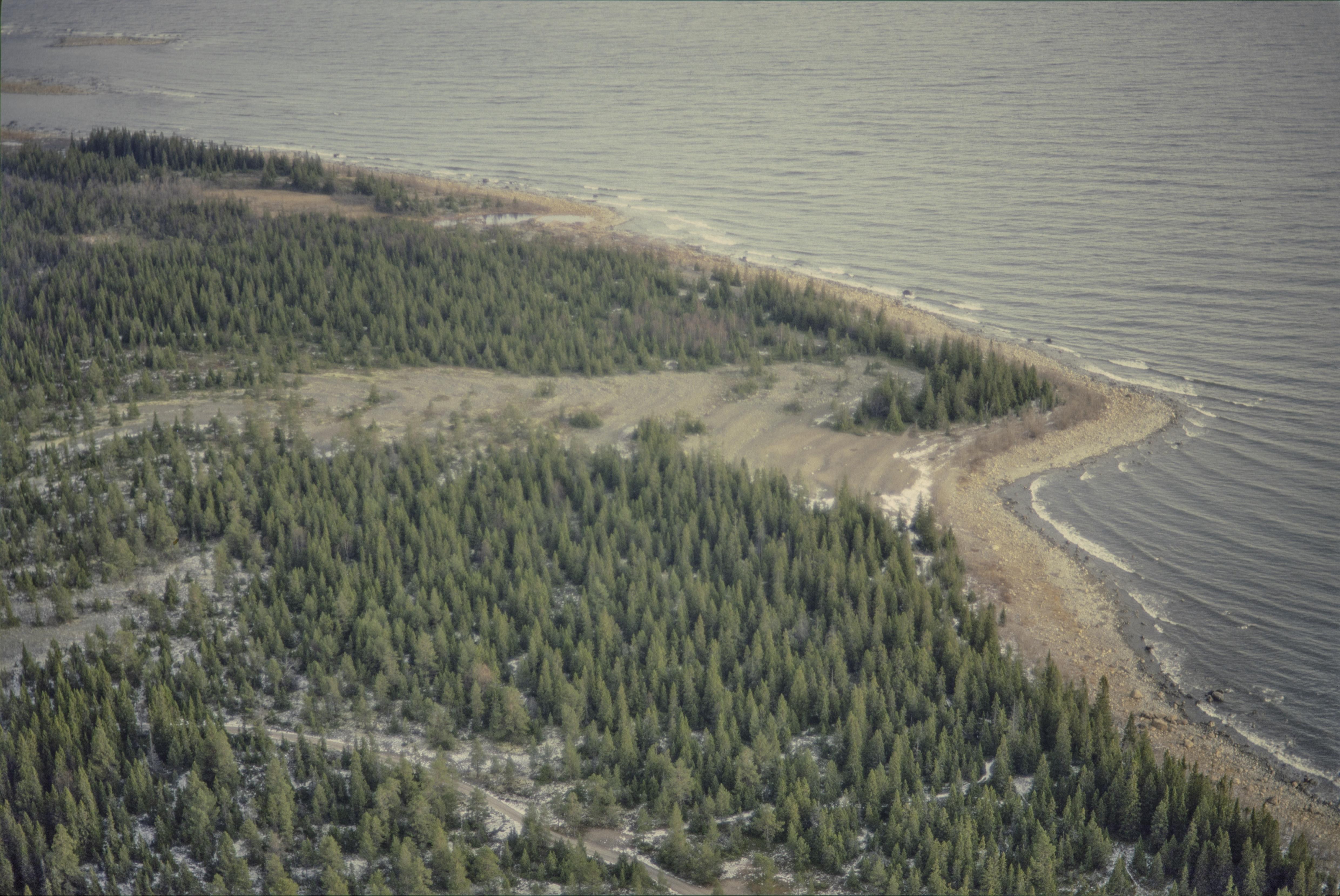 Beskrivning: Området Grundskatan i sydöstra delen av udden Bjuröklubb. Vid och under bildens mitt Grundskataräften och ett fornlämningsområde med fiskeläge, gravfält och labyrint RAÄnr Lövånger 78:1-2. Bilden är tagen mot (väderstreck): NNO