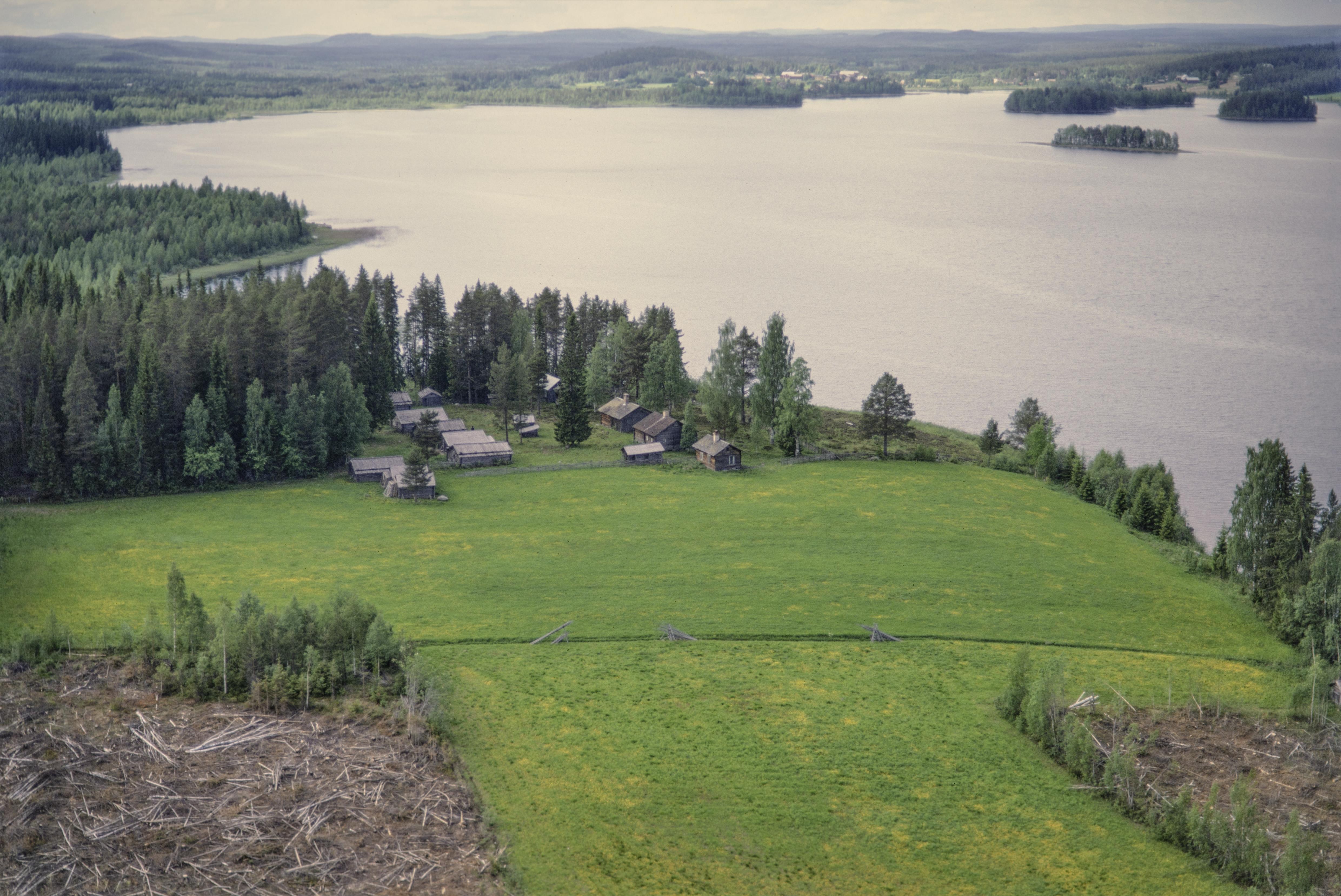Beskrivning: Fäbodområdet Östdalbodarna vid södra stranden i naturreservatet Myckelgensjösjön. Nere vid stranden till höger boplats RAÄnr Anundsjö 375:1. I bildens övre del Myckelgensjö by. Bilden är tagen mot (väderstreck): NV