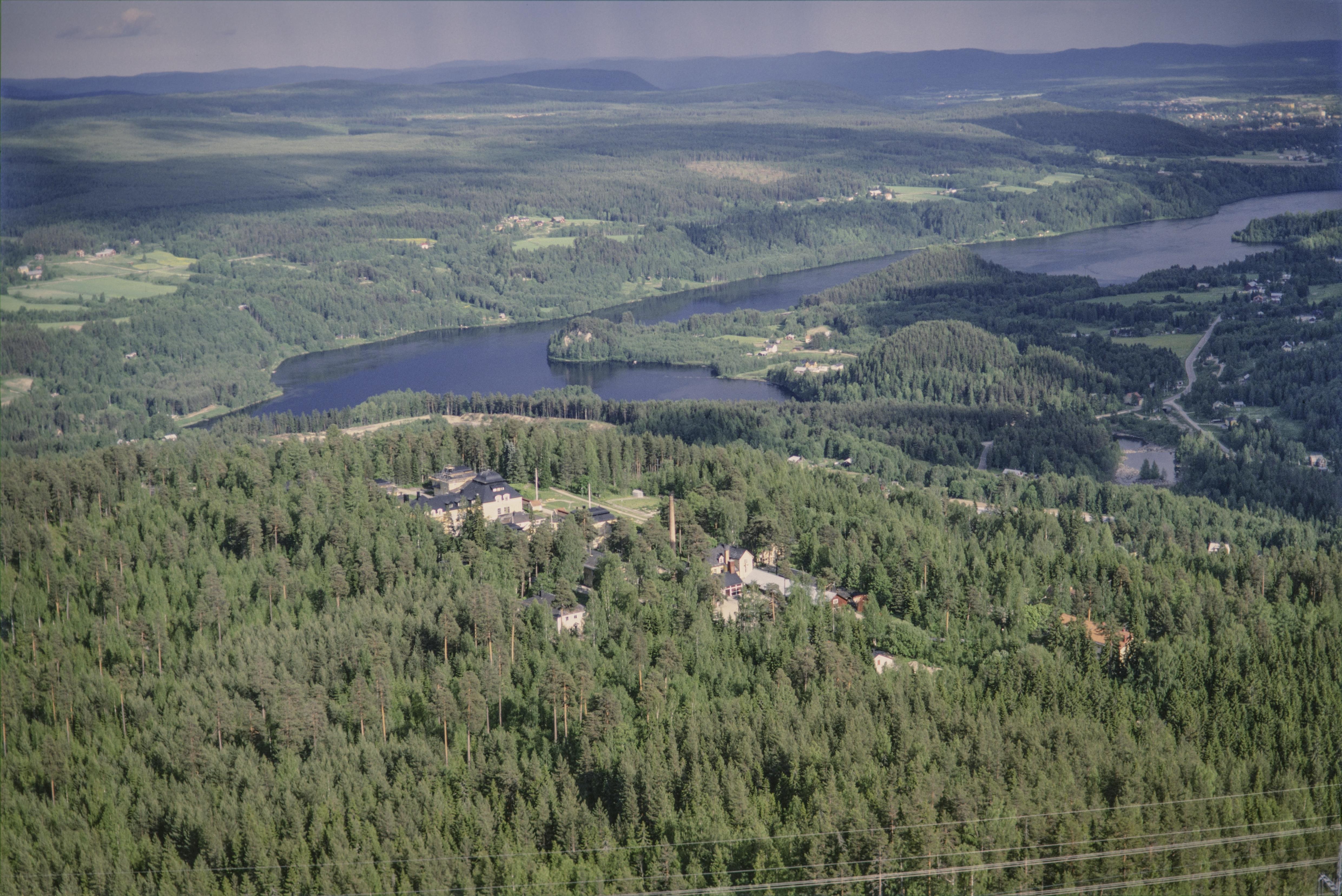 Beskrivning: Norr om orten Österås där Ångermanälven och Faxälven möts. Under bildens mitt byggnadsminnet Österåsens sanatorium och minnesstenen RAÄnr Ed 81:1. Faxälven över bildens mitt markerar gränsen mot Sollefteå socken. Bilden är tagen mot (väderstreck): OSO