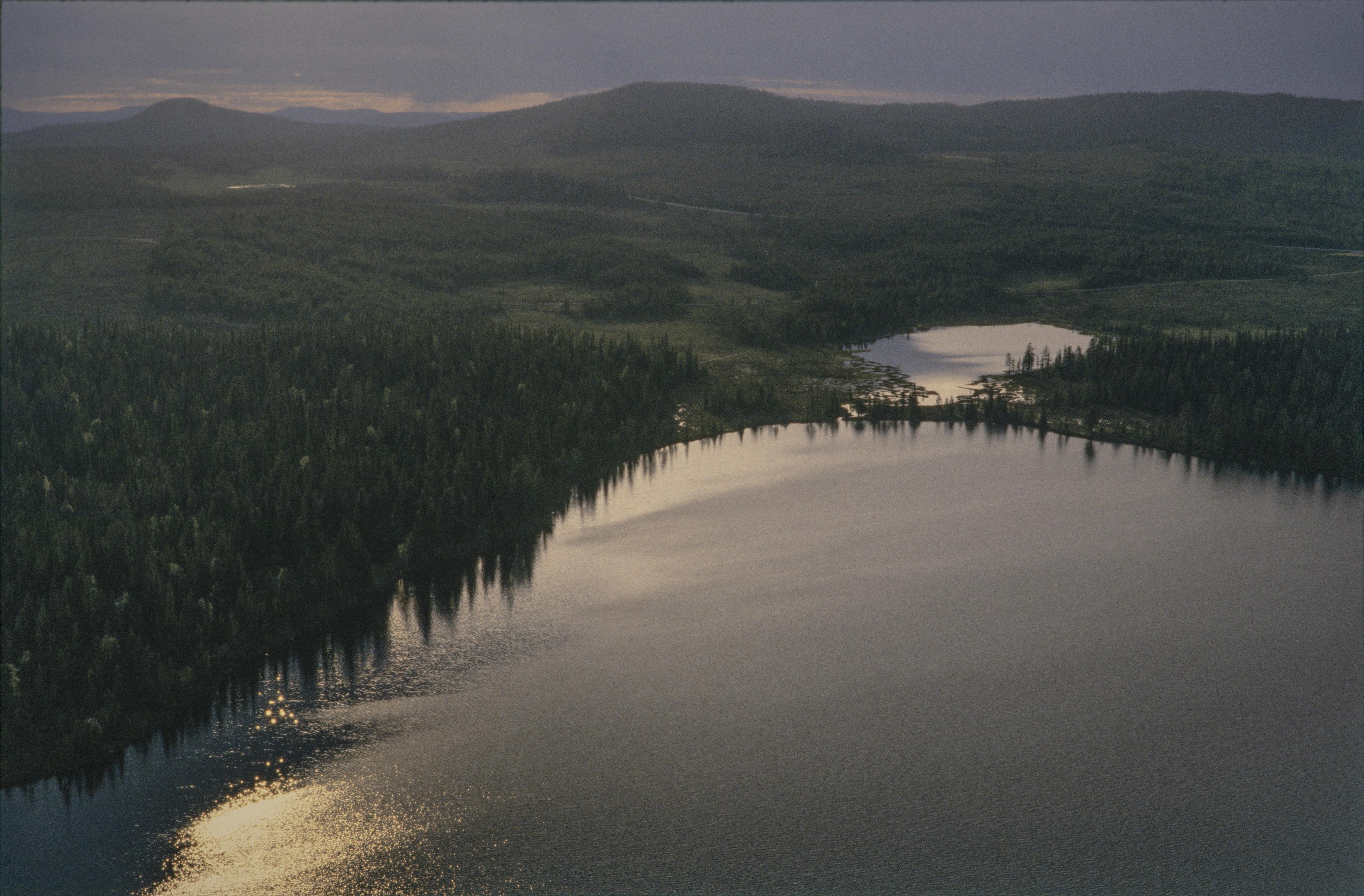 Beskrivning: Geijaurevallen, en renvall vid sjön Geijaure (Giejjure). Till vänster om bildens mitt bergsområdet Giejjavárrie. Bilden är tagen mot (väderstreck): NNV