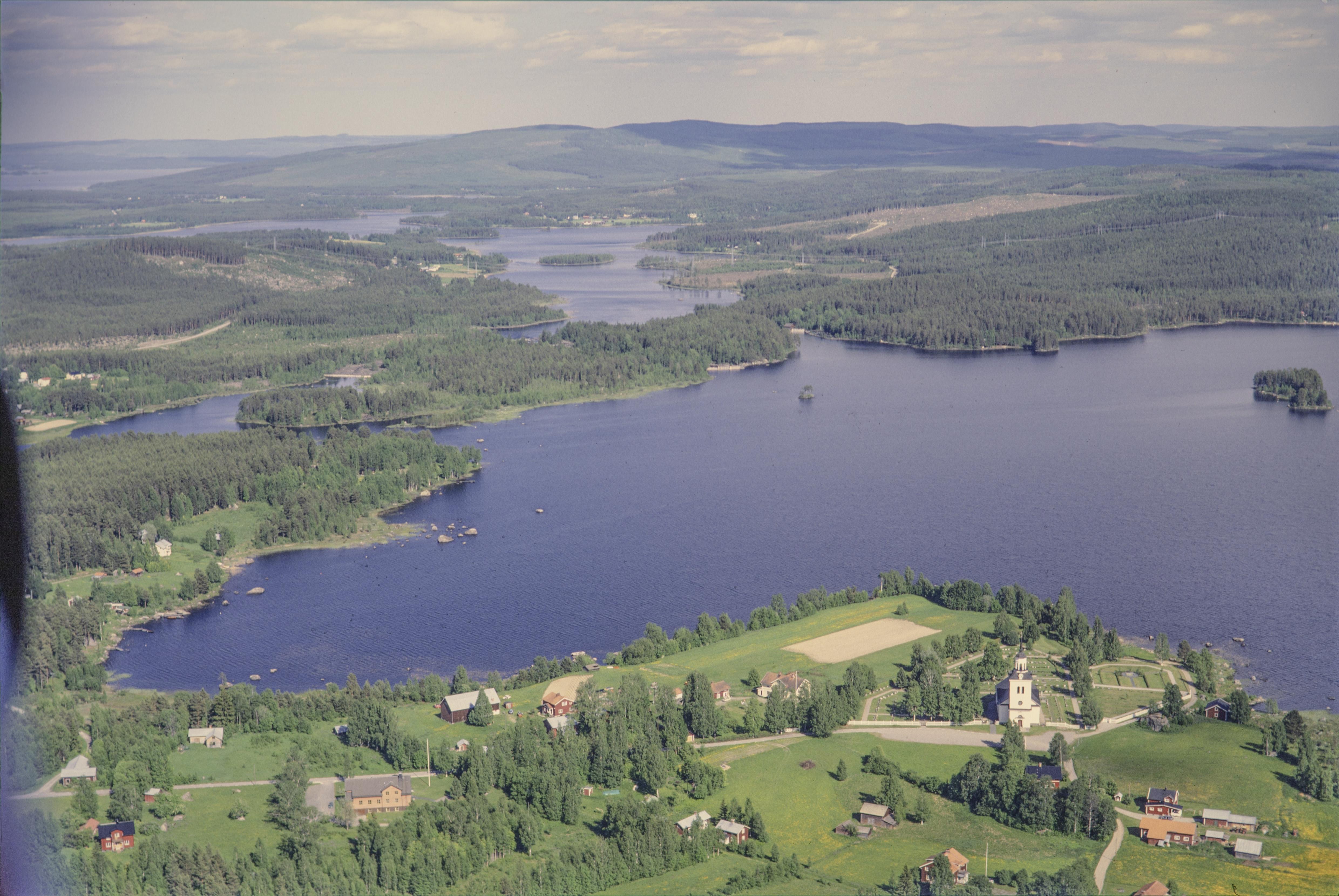 Beskrivning: Nere till höger Haverö kyrka och boplats RAÄnr Haverö 382:1 vid Kyrksjön. Till vänster om bildens mitt Sjul-Jönsudden. I ån Ljungans dalgång i bildens övre del naturreservatet Haverö strömmar mot Kölsillre by. Bilden är tagen mot (väderstreck): OSO
