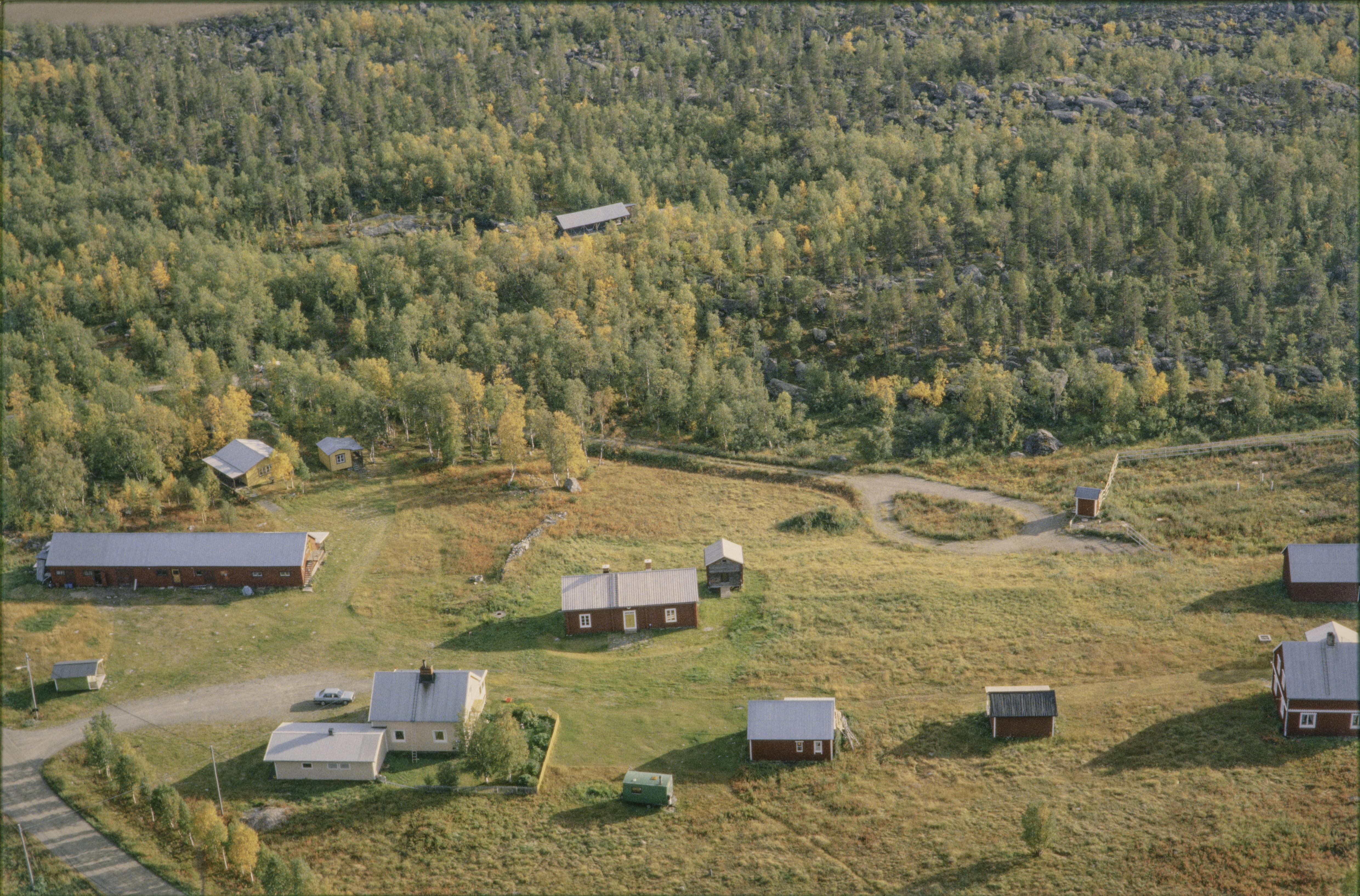 Beskrivning: Adolfsström (skrivs även Adolfström) by och f.d. bruk mellan sjöarna Lárvvejávrre och Mittisjön (Gasskajávrre) vid Laisälven (Lájsso). Vid bildens mitt bruksgården Majorsgården i hyttområde RAÄnr Arjeplog 566:1, m.m. Bilden är tagen mot (väderstreck): S