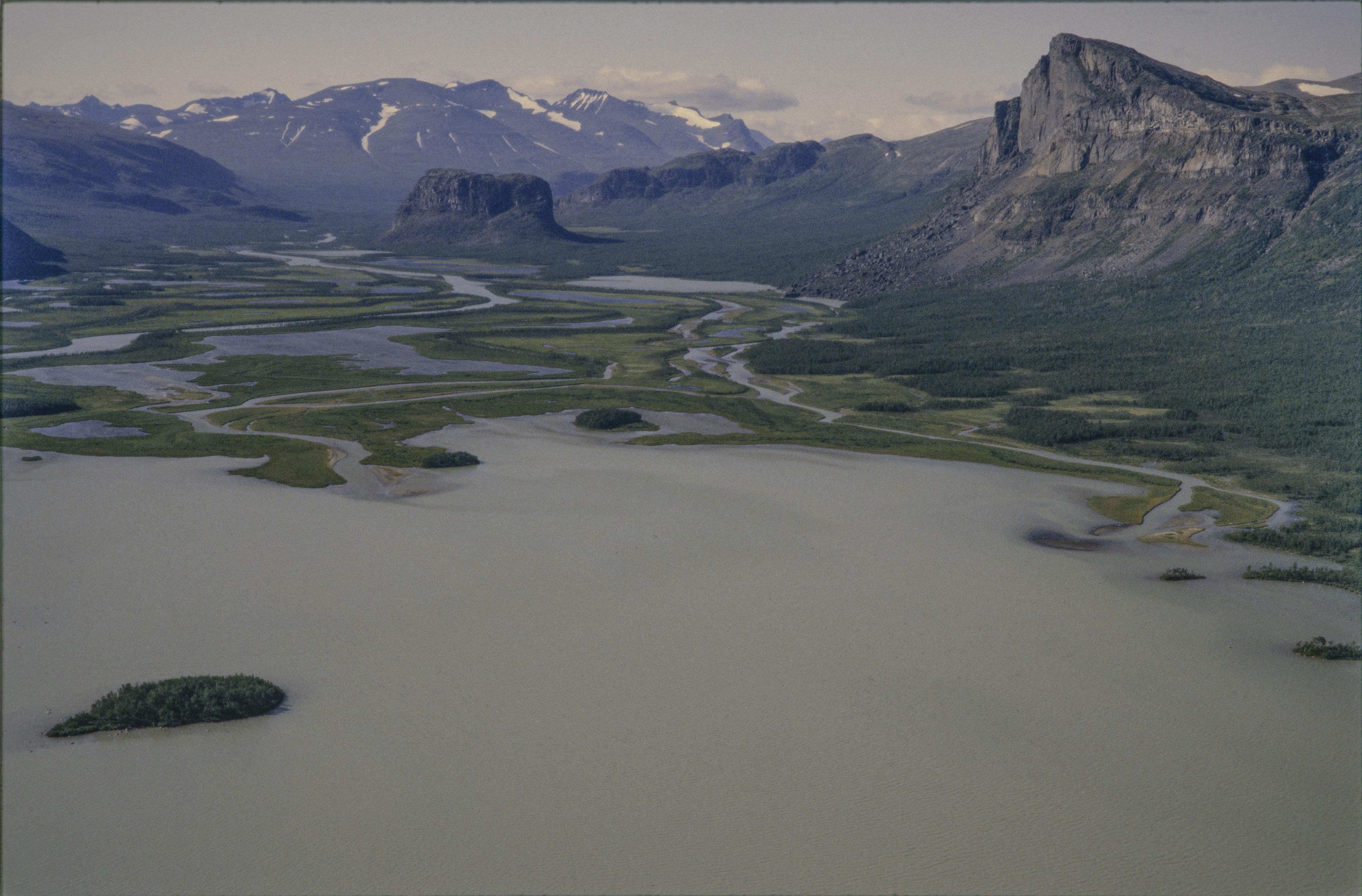 Beskrivning: Sjön Laitaure (Lájtávrre / Lajtjaure), västra delen. Över bildens mitt Rapadeltat vid Rapadalen (Ráhpavuobme). I deltat offerplats RAÄnr Jokkmokk 52:1. Ultevis fjällurskogs naturreservat. Bilden är tagen mot (väderstreck): NV